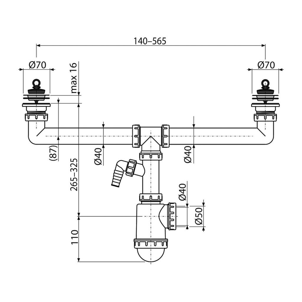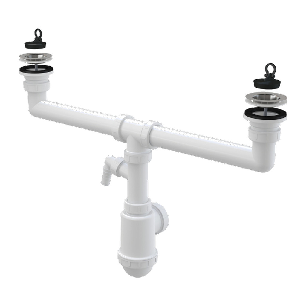Domov » Sanita » Kúpeľne » Odtokové systémy » AlcaPlast A449P-DN50/40 – Sifón pre dvojdrez s nerezovými mriežkami DN70 a prípojkou