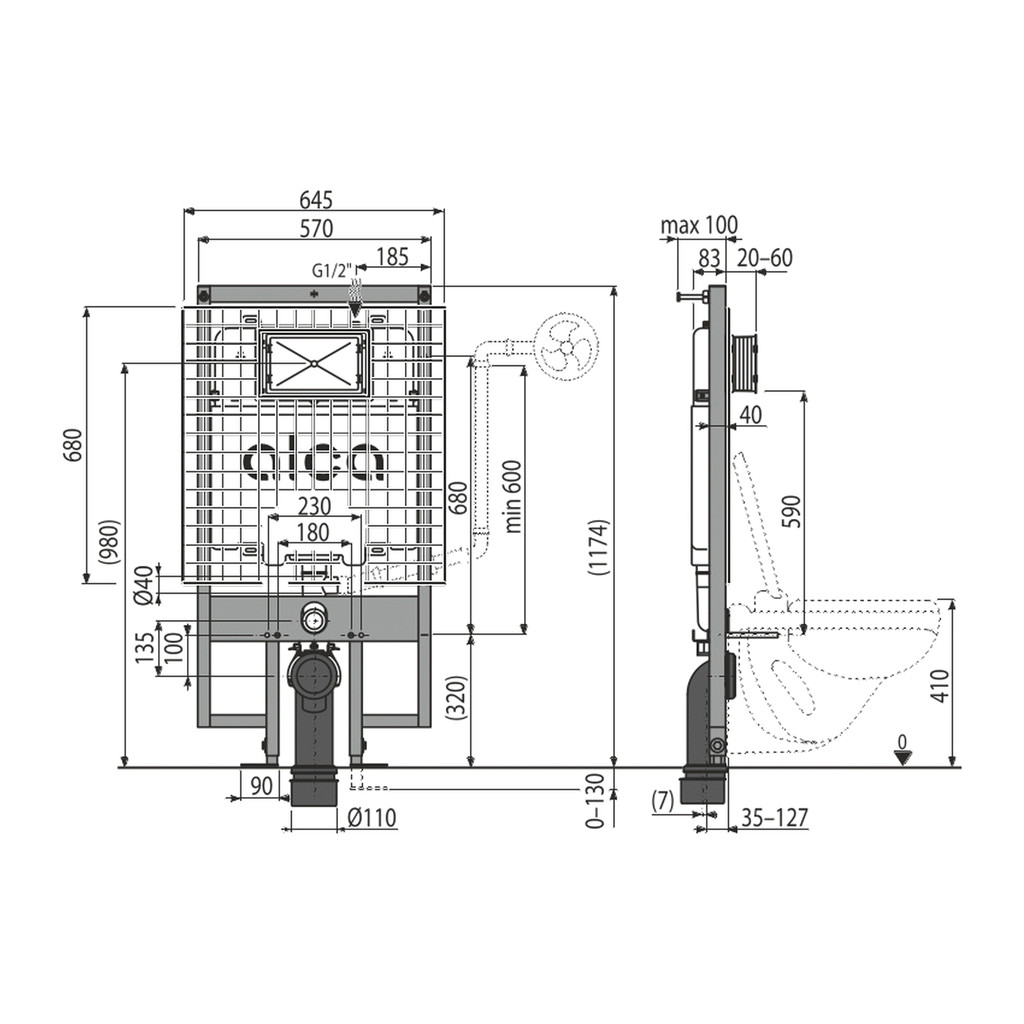 Pre montáž závesného WC s pripojovacím rozstupom 180 mm alebo 230 mm