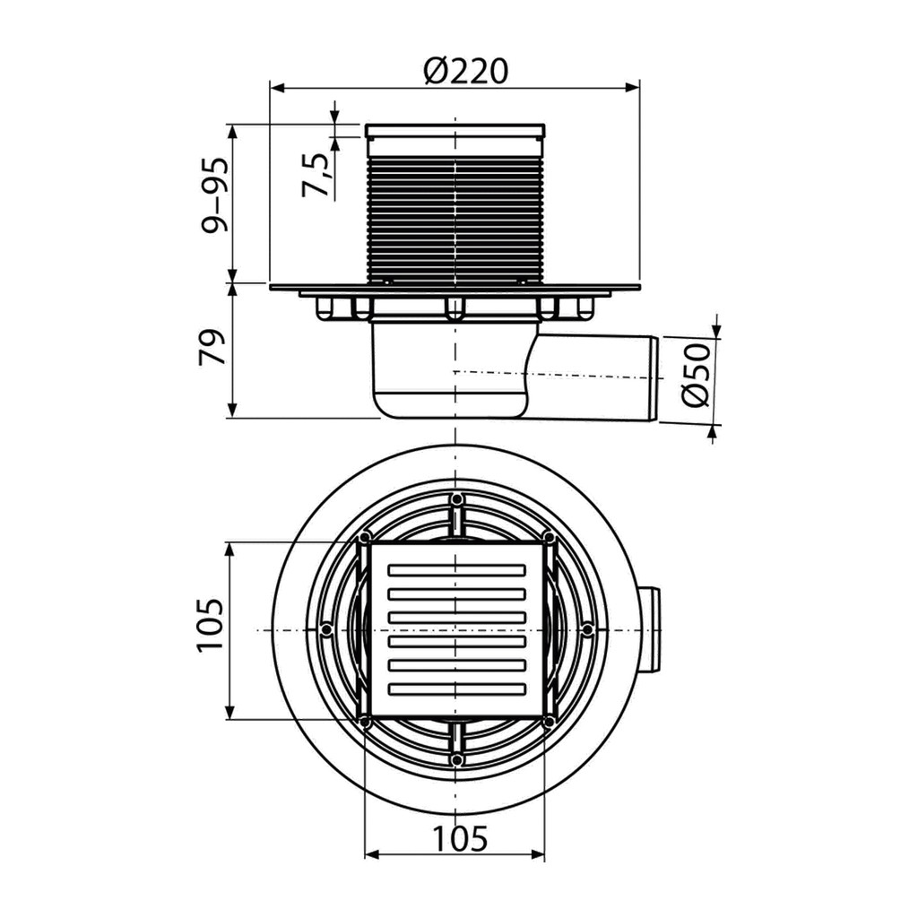 Domov » Sanita » Kúpeľne » Sprchové žľaby a rošty » Podlahové vpuste » AlcaPlast APV103 – Podlahová vpusť 105×105/50 mm bočná, mriežka nerez, vodná zápachová uzávera