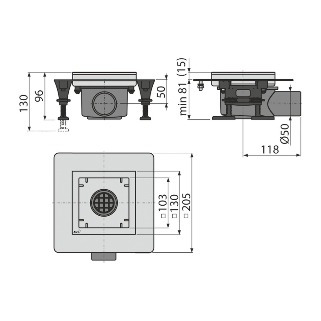 Domov » Sanita » Kúpeľne » Sprchové žľaby a rošty » Podlahové vpuste » AlcaPlast APV120 – Podlahová vpusť nerezová nízka 130×130 mm bočná, bez mriežky, Kombinovaná zápachová uzávera SMART