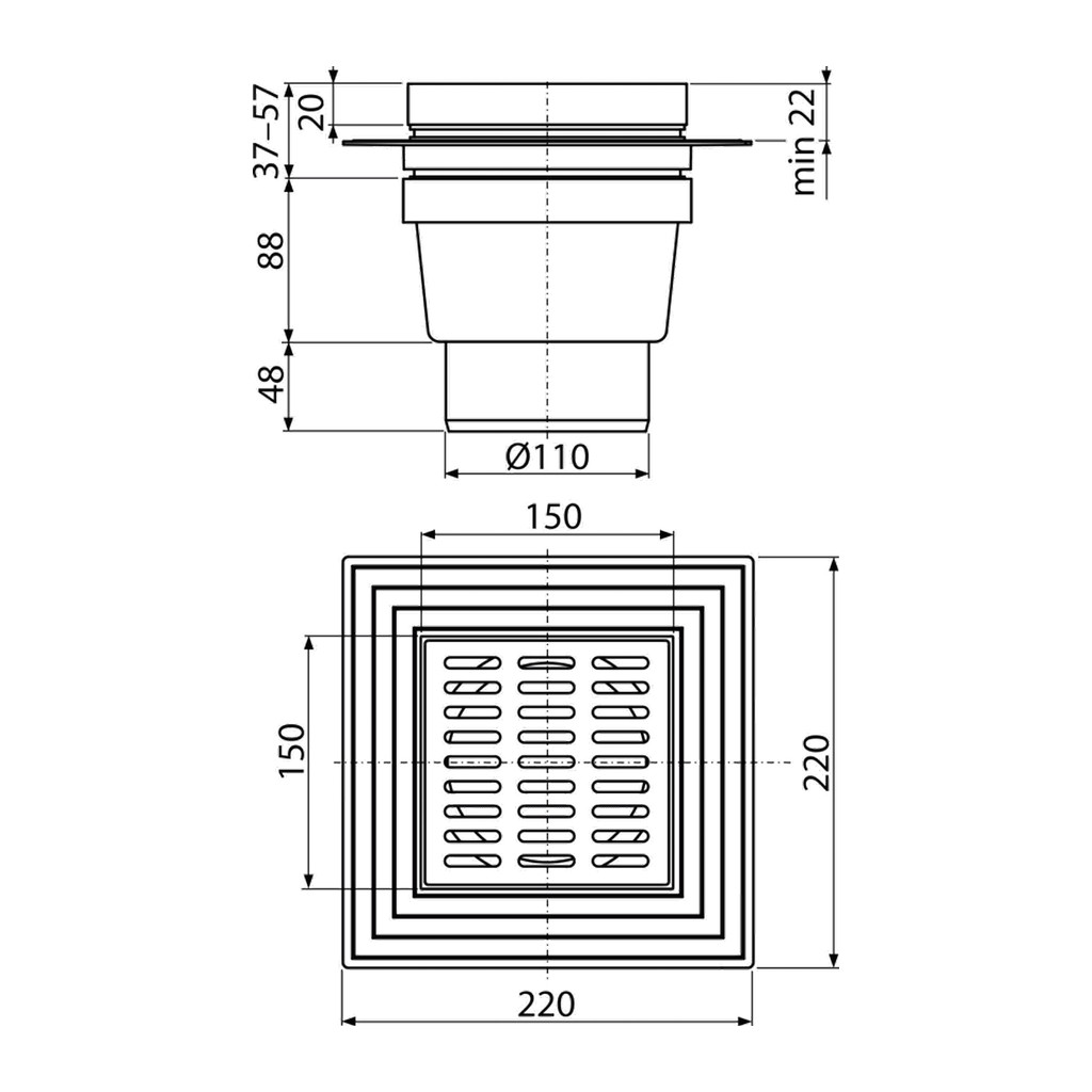 AlcaPlast APV13 – Podlahová vpusť 150×150/110 mm priama, mriežka nerez, límec 2. úrovne izolácie, vodná zápachová uzávera