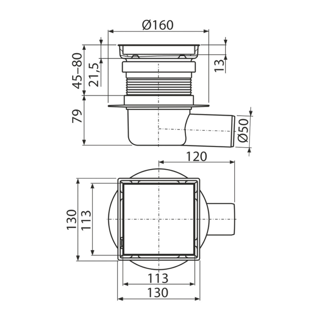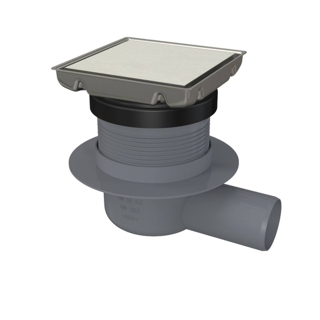 Domov » Sanita » Kúpeľne » Sprchové žľaby a rošty » Podlahové vpuste » AlcaPlast APV140 – Podlahová vpusť 130×130 mm bočná, obojstranná nerezová mriežka, vodná zápachová uzávera