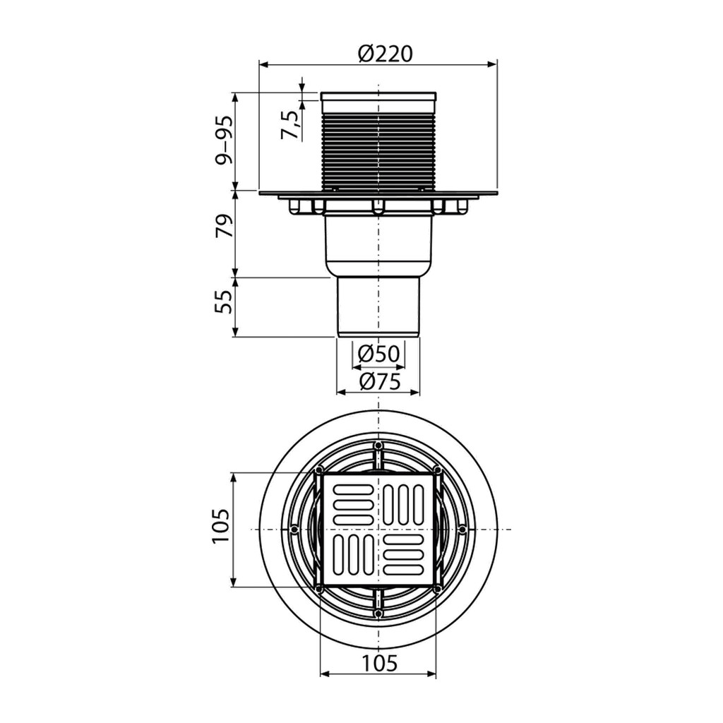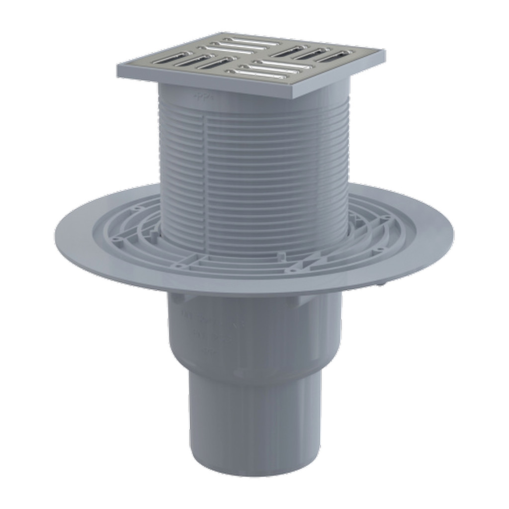 AlcaPlast APV2321 – Podlahová vpusť 105×105/50/75 mm priama, mriežka nerez, kombinovaná zápachová uzávera SMART