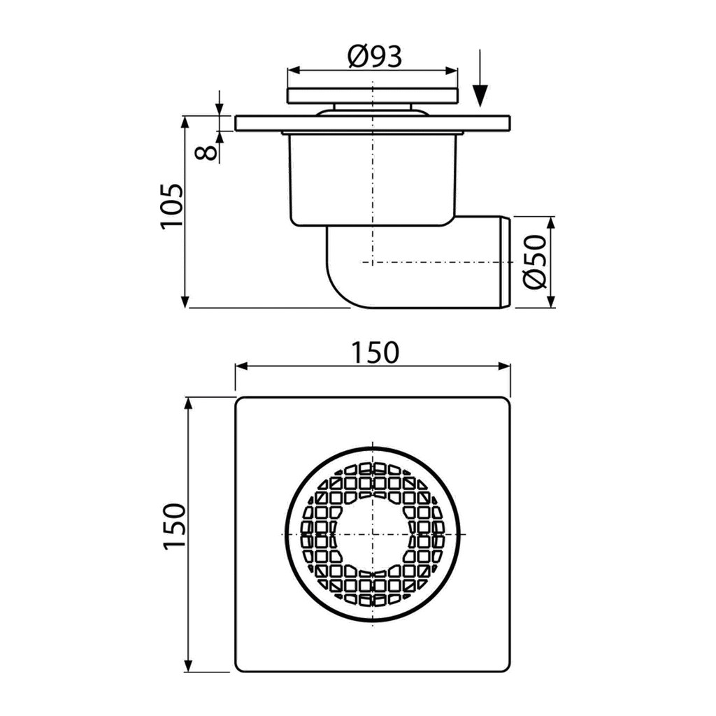 Domov » Sanita » Kúpeľne » Sprchové žľaby a rošty » Podlahové vpuste » AlcaPlast APV3 – Podlahová vpusť 150×150/50 mm bočná, mriežka šedá, vodná zápachová uzávera