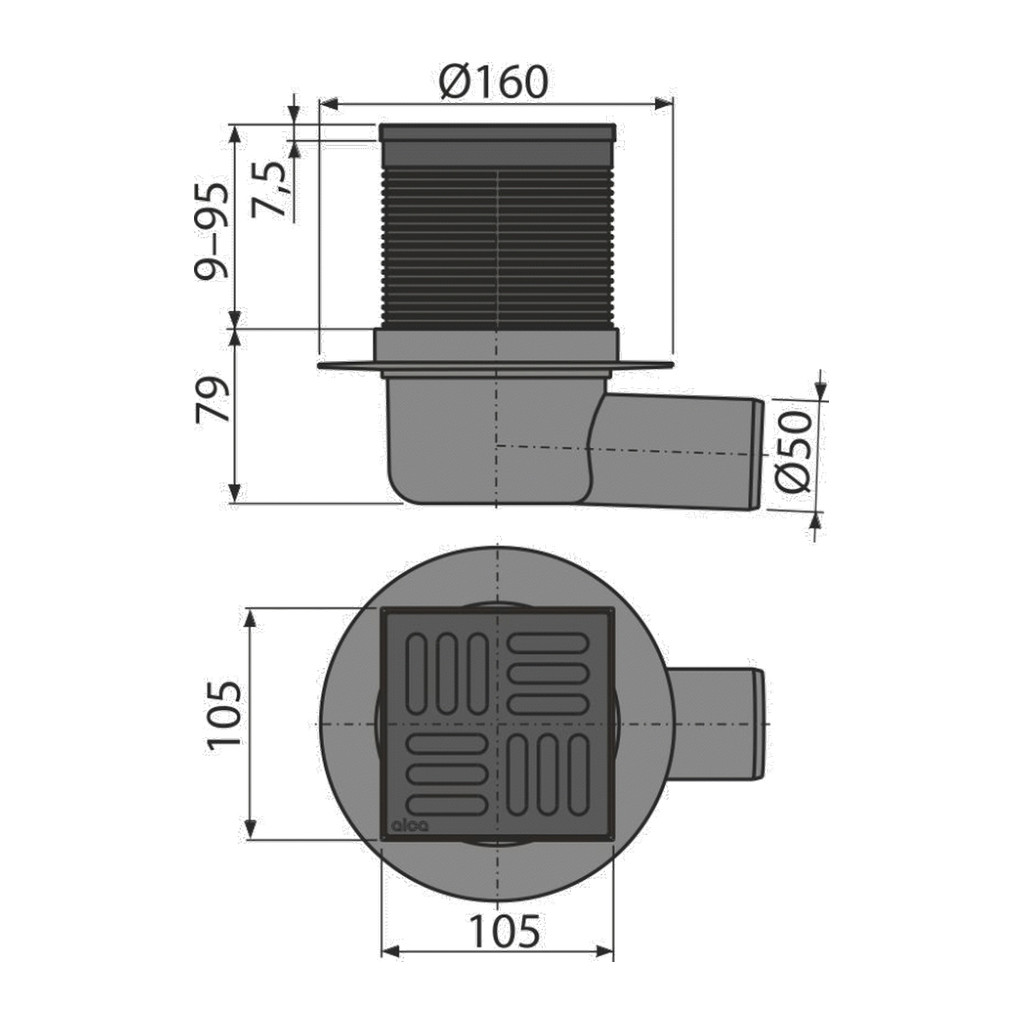 AlcaPlast APV31BLACK – Podlahová vpusť 105×105/50 mm bočná, mriežka nerez čierna-mat, kombinovaná zápachová uzávera SMART