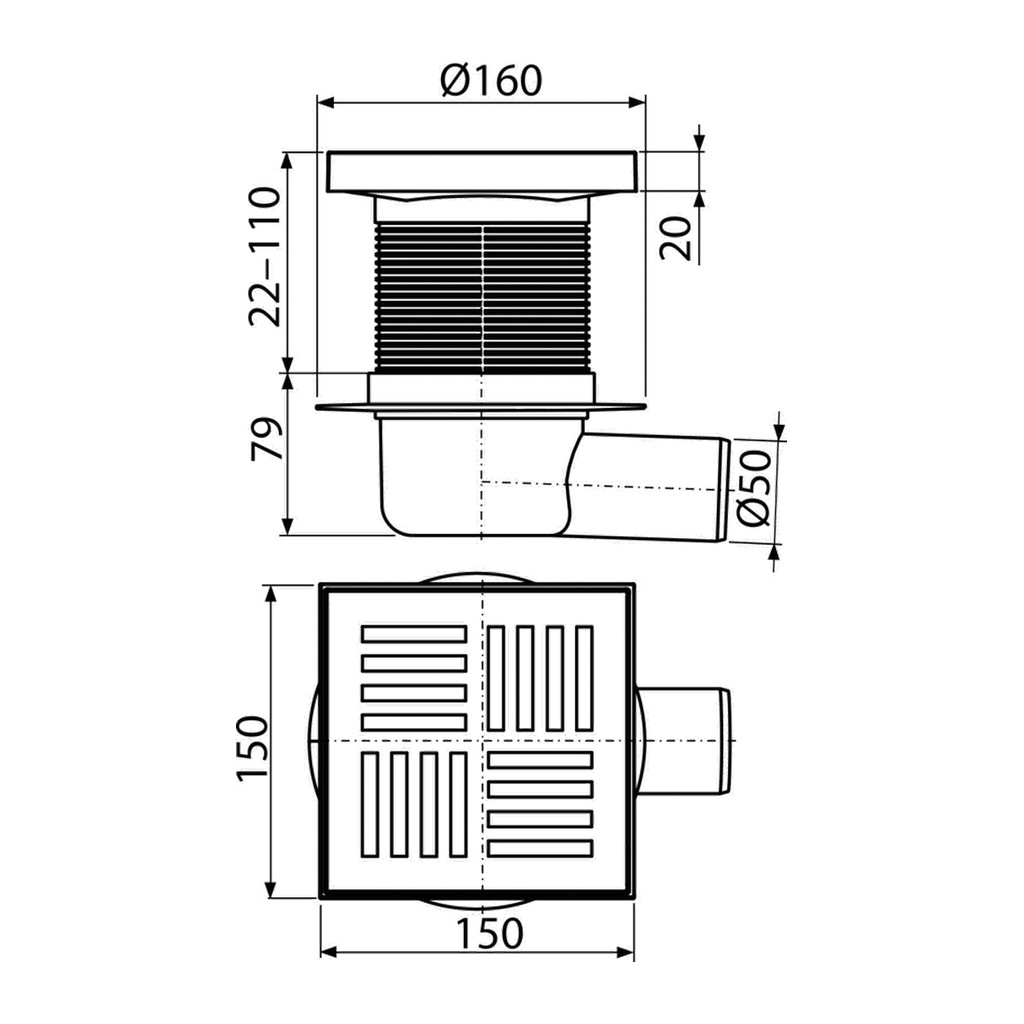 Domov » Sanita » Kúpeľne » Sprchové žľaby a rošty » Podlahové vpuste » AlcaPlast APV5211 – Podlahová vpusť 150×150/50 mm bočná, mriežka šedá, vodná zápachová uzávera