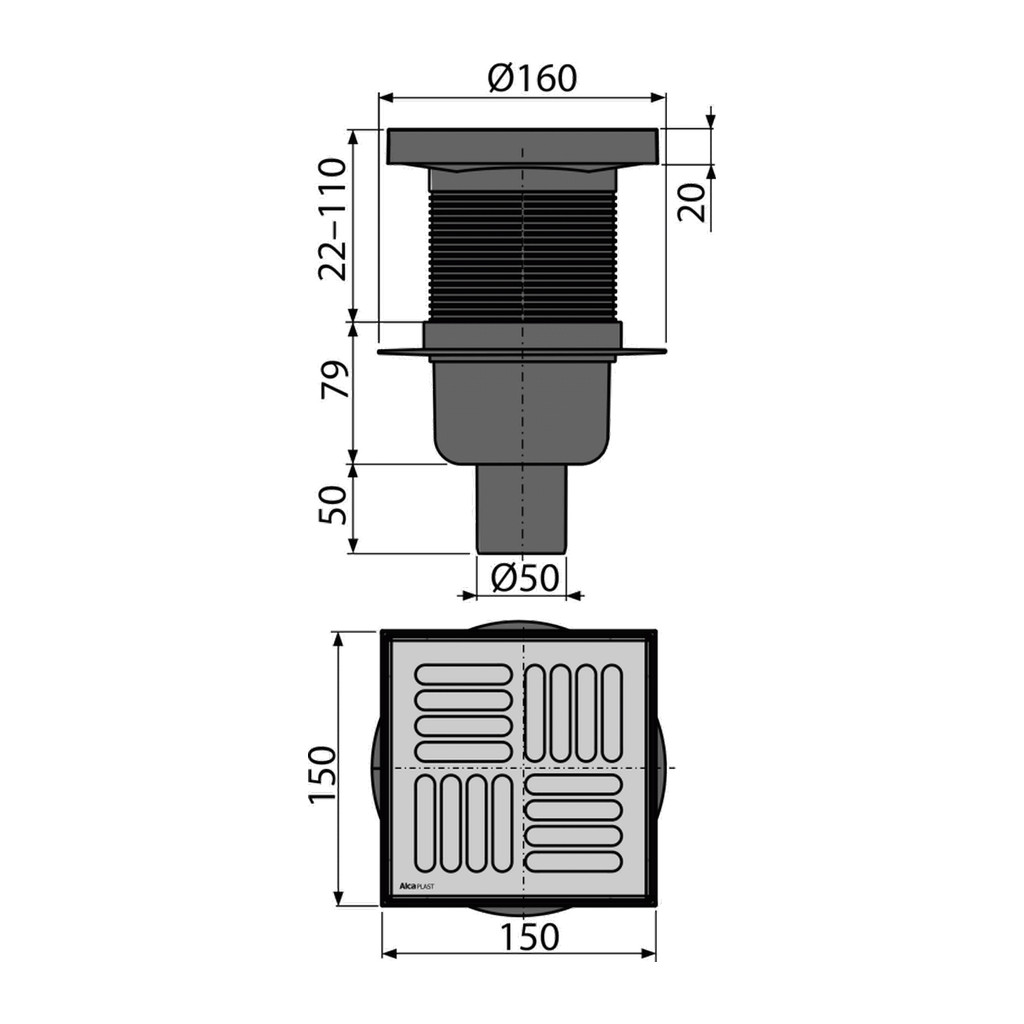 Domov » Sanita » Kúpeľne » Sprchové žľaby a rošty » Podlahové vpuste » AlcaPlast APV6411 – Podlahová vpusť 150×150/50 mm priama, mriežka nerez, vodná zápachová uzávera