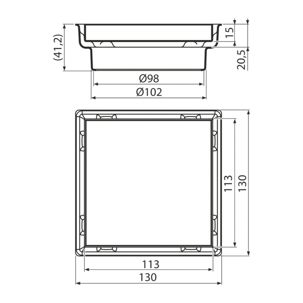 Domov » Sanita » Kúpeľne » Sprchové žľaby a rošty » Podlahové vpuste » AlcaPlast APVN0100 – Nástavec hrdla vpusti + Obojstranný rošt 130×130 mm, nerez
