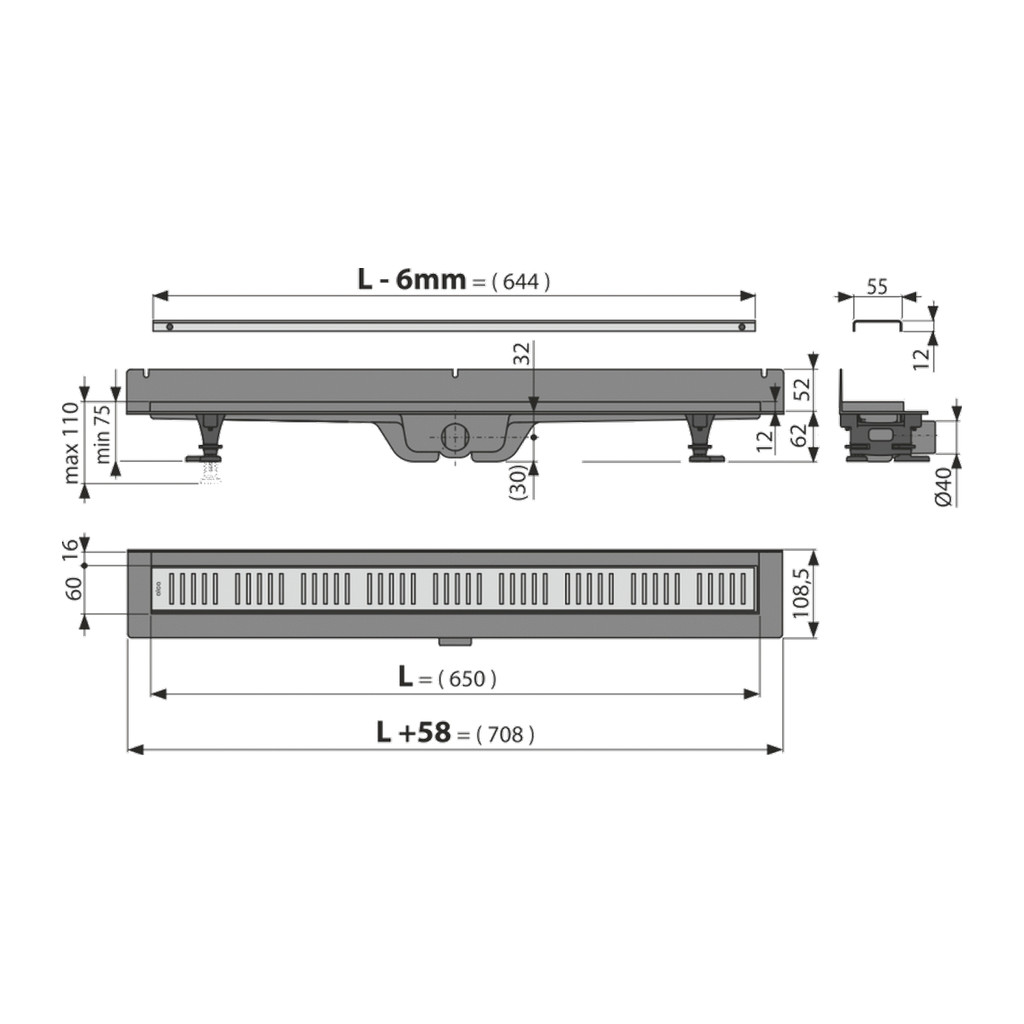 Domov » Sanita » Kúpeľne » Sprchové žľaby a rošty » Sprchové žľaby » AlcaPlast APZ30-650M – Podlahový žľab s okrajom pre perforovaný rošt a s pevným límcom ku stene