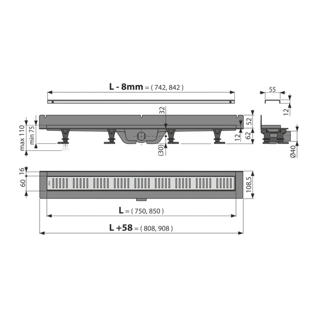 Domov » Sanita » Kúpeľne » Sprchové žľaby a rošty » Sprchové žľaby » AlcaPlast APZ30-850M – Podlahový žľab s okrajom pre perforovaný rošt a s pevným límcom ku stene