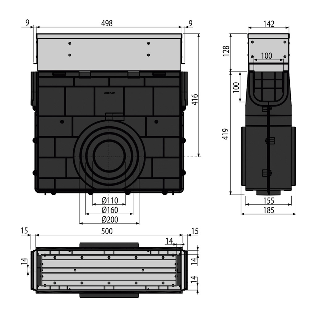 Domov » Vonkajšie žľaby » AlcaPlast AVZ101R-R323R – Vonkajšia žľabová vpusť štrbinová so symetrickým revíznym nástavcom 100 mm, nerez