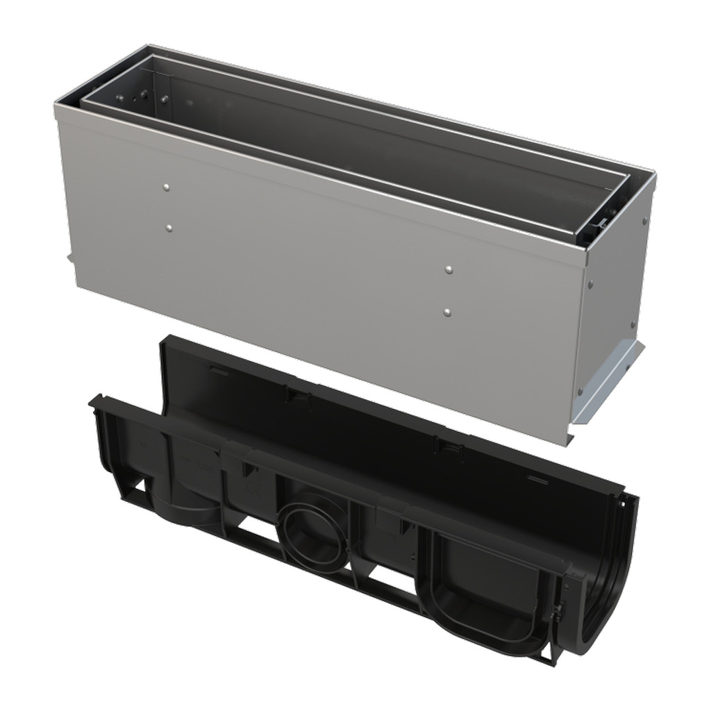Materiál žľabu: polypropylén plnený mastencom odolný proti mechanickému, chemickému a tepelnému poškodeniu