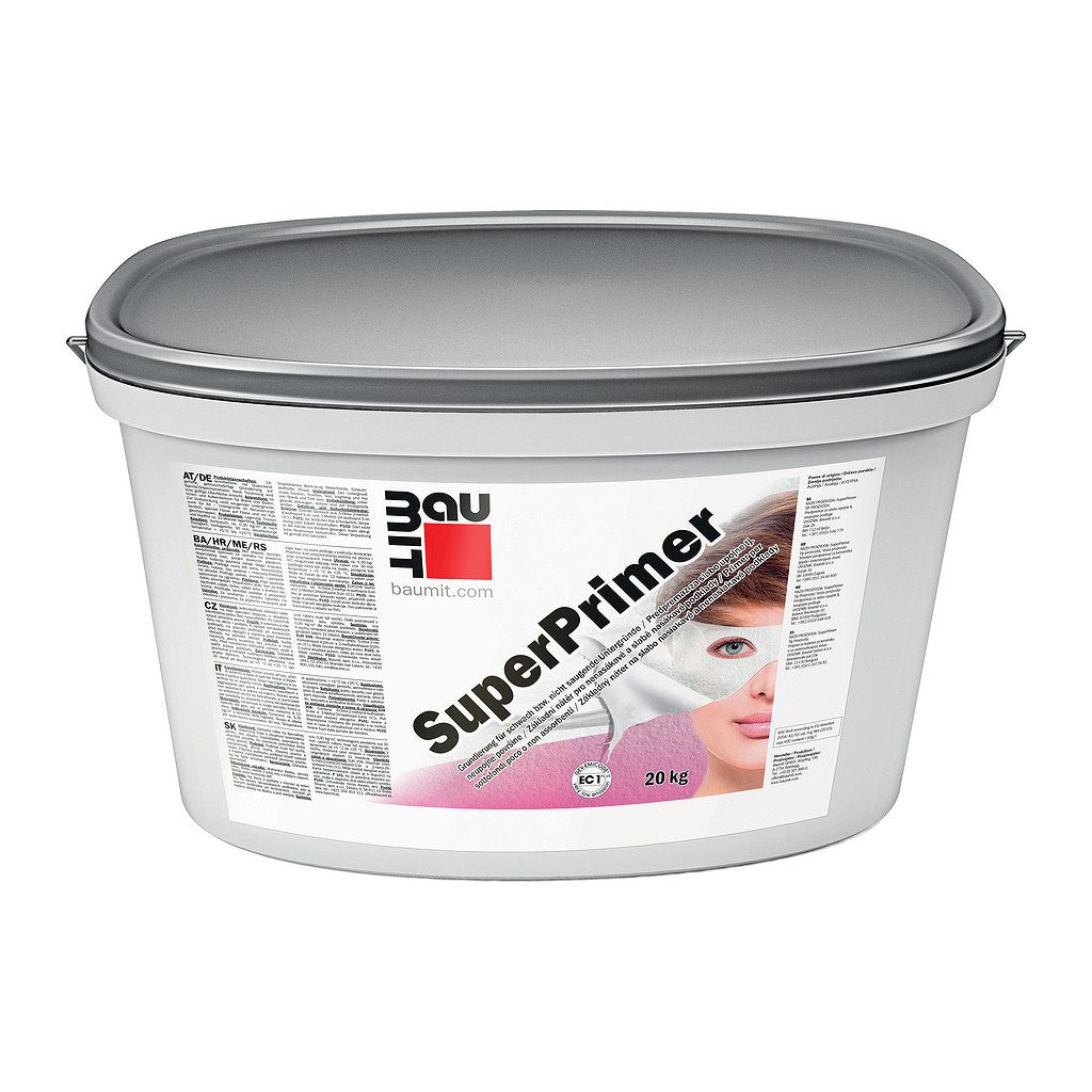 Baumit SuperPrimer je špeciálny penetračný náter žltej farby s plnivom z kremičitého piesku, určený na prípravu málo nasiakavých a nenasiakavých podkladov pred aplikáciou omietok, poterov a lepidiel. Poskytuje vysokú prídržnosť a eliminuje tvorbu bubliniek na betónovom podklade.