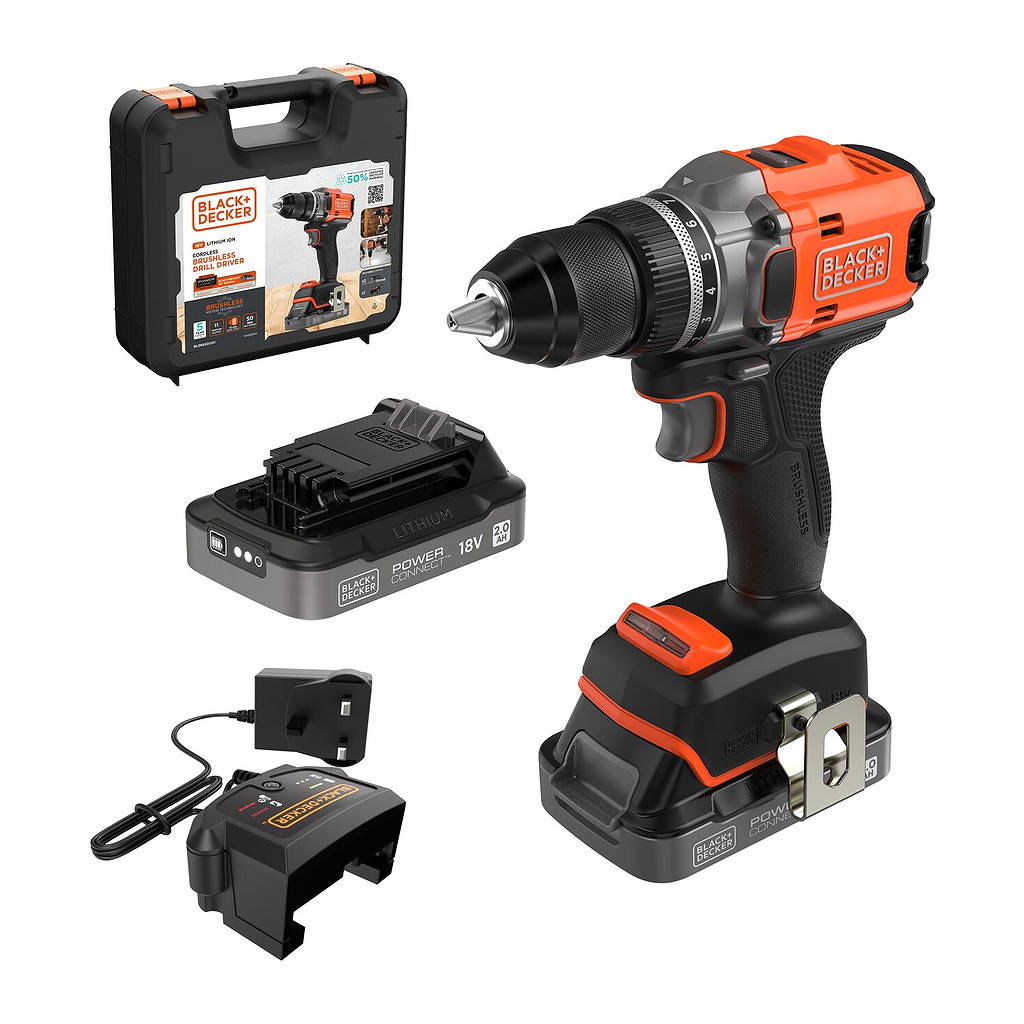 Black+Decker BLD682D2XK – AKU vŕtačka skrutkovač, 18V, bezuhlíková, rýchloupínacie skľučovadlo 13mm, 2× AKU 2,0Ah, nabíjačka, kufor