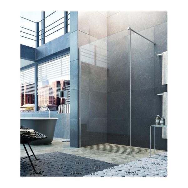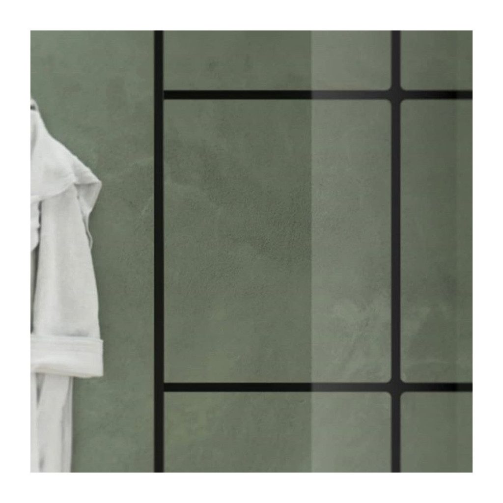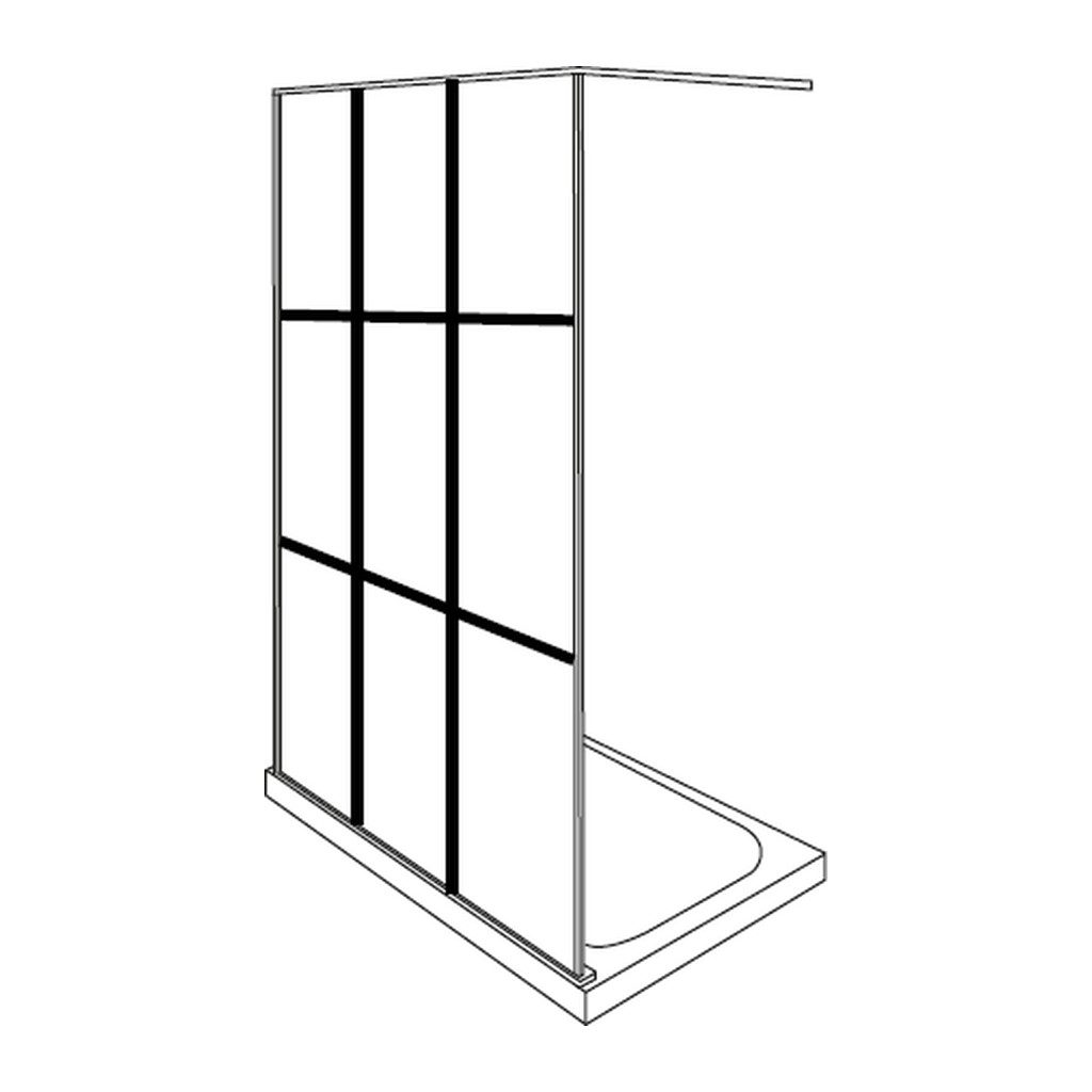 Pevná voľne stojaca stena, elegantná čierna matná. Walk-In stena a dizajn s originálnym sklom s efektom skleníkových okien, ktorý dáva kúpeľni jedinečný moderný a sofistikovaný štýl.
