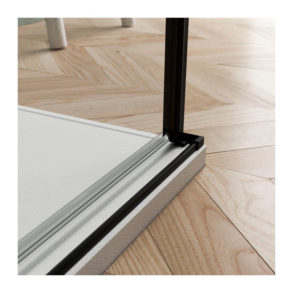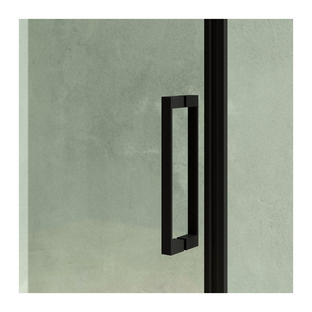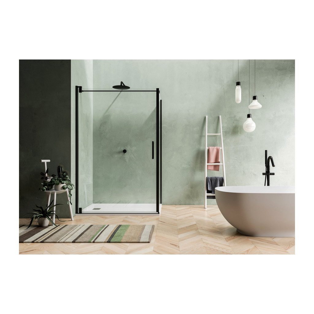 Kyvadlové dvere pre kombináciu s bočnou stenou, elegantná čierna matná. Medzi najdôležitejšie funkcie patrí závesný systém otvárania dverí, ktorým sa dajú otvoriť dovnútra aj von, čo umožňuje nielen zvýšenú bezpečnosť, ale aj väčšiu všestrannosť, pretože sa dajú ľahko prispôsobiť malým a multifunkčným kúpeľňovým priestorom. Profily sprchového kúta sú čiernej farby, ktorá dáva kúpeľni jedinečný moderný a sofistikovaný štýl.