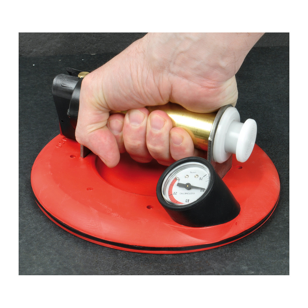 Přísavka 300-76 s průměrem 200 mm pro práci s velkoformátovými dlažbami nebo dlažbami větších tloušťěk (2 cm). S ukazatelem tlaku. Přísavka slouží k manipulaci s těžšími dlažbami, což jsou hlavně velkoformátové dlažby nebo dlažby vyšší tloušťky (2 cm). Usnadňuje usazování dlaždic, manipulaci s nimi a umožňuje zpětné vyjmutí usazené dlaždice nebo její posunutí bez poškození okolních dlaždic. Velký průměr přísavky 200 mm a silná pumpička zajistí dostatečný tlak a sílu pro manipulaci. Pro kontrolu podtlaku je přísavka vybavena indikátorem, který ukazuje aktuální tlak na přehledné stupnici. Pro zajištění dostatečné přísavné síly je potřeba, aby tlak byl nad červenou zónou stupnice. Okraje přísavné plochy jsou opatřeny trojvrstvou barierou pro lepší přilnutí na dlažbách s reliéfním povrchem. Přísavka je dodávána včetně plastového krytu přísavné plochy a transportního obalu, které zajištují důležitou ochranu při převozu. Je důležité udržovat přísavnou plochu čistou a chránit ji před poškozením nebo otlačením. Zaprášená plocha přísavky nebo manipulované dlažby může snížit její účinek a prach může zanechat na dlažbě obrys, který lze těžce odstranit. Lze použít i na manipulaci se sklem, kovem, plastem a materiálem s rovným povrchem.