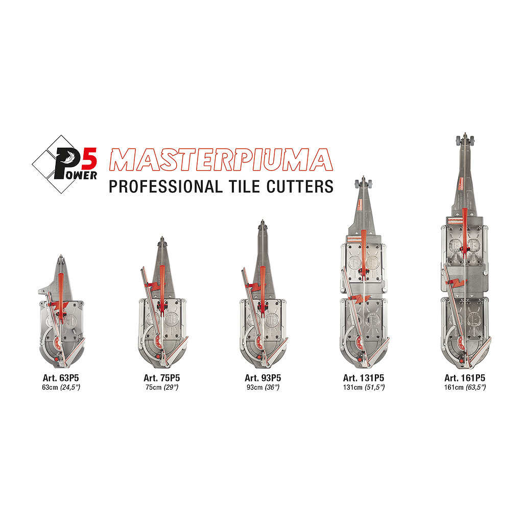 Novinka 2024. Profesionální řezačka MASTERPIUMA POWER P5 s délkou řezu 63 cm na obklady, dlažbu a mozaiku. Provedení XL – prodloužený úhelník a výklopné podpěry na obou stranách. Vylepšené provedení XL řezačky 63 P5, které má prodloužený úhelník a výklopné podpěry na obou stranách. Ruční řezačka Masterpiuma POWER P5 má dlouhý rotační úhelník s výklopným prodloužením na levou stranu. Celý úhelník lze s řezanou dlažbou natočit do požadovaného úhlu a lze jednoduše provádět přesné diagonální řezání. Úhelník je opatřen měřítky na obou stranách. Konstrukce řezačky je z tlakově litého hliníku a poniklované oceli a celkově vytváří kompatibilní a pevný materiál, který je odolný proti poškození a zajišťuje nízkou hmotnost řezačky ve své třídě. Ergonomická rukojeť- páka umožňuje efektivní řezání většinu obkladových materiálů – keramika, slinutá keramika, gress, obklad, kámen, skleněné obklady. Páka jezdí po silné traverze tloušťky 7 mm. Poloha řezacího kolečka se přizpůsobí různým tloušťkám a reliefům materiálu. Lze řezat až 2 cm tlustý materiál, ale doporučujme řezačku používat na obvyklé dlažby tl. 5-15 mm. Dlažby tl. 2 cm je ideální řezat na vodou chlazené pile s diamantovým kotoučem SCX nebo SCXS-T. Kontaktujte nás, rádi Vám poradíme nebo Vám tuto řezačku osobně předvedeme. Titanové řezací kolečko 245T je promazáváno z výměnné nádržky OIL, která je umístěna na páce řezačky. Rozšířené odpružené stoly zajišťují přesnost při lámání obkladů a dlažby. Přesný pohyb páky je zajištěn díky zařízení R.A.S. (boční ložisko), které vytváří kontakt s vodící traverzou a zabraňuje jakémukoliv bočnímu pohybu. Jedná se o válec vyrobený z materiálu s minimálním třením a velkou odolností proti opotřebení. Polohu válce lze nastavit pomocí dvou šroubů a tím lze zvolit kdykoliv případnou vůli páky na traverze. Povrch páky je opařten speciálním plastovým nástřikem, který je vysoce odolný proti poškrábání. Sklopný lamač umístěný ve spodní části páky má dvě funkční polohy. V základní poloze (přiklopen) slouží pro lámání obkladů a dlažby, kdy páka je umístěna na začátku pracovního stolu (u úhelníku). V praxi to znamená, že po naříznutí dlažby dojedete s pákou až ke gumovému dorazu, který je na konci vodící traverzy. Řezací kolečko sjede z materiálu do sníženého prostoru nad úhelníkem. Nyní můžete rovnou lámat tlakem nebo rázem na páku. Není potřeba vyklápět lamač – pohyb navíc. Po vyklopení lamače lze lámát v jakékoliv části stolu, této možnosti se využívá při řezání a lámání jednotlivých dílků mozaiky, při řezání úhlopříčně a při dolamování problematičtějších materiálů z druhého konce. Pro snadnější a rychlejší řezání mozaiky doporučujeme použít speciální podložku Mosakit. Nevíte si rady, jak uříznout přesný, stejně široký pásek nebo sokl? Jednoduchá pomoc! Použijte vytyčovací doraz 64 k řezačkám pro řezání úzkých pásků stejné šířky a obkladových soklů. Následující video Vám ukáže pracovní postup s řezačkou. Na videu je delší model 93 P5, který má navíc zesílenou traverzu.