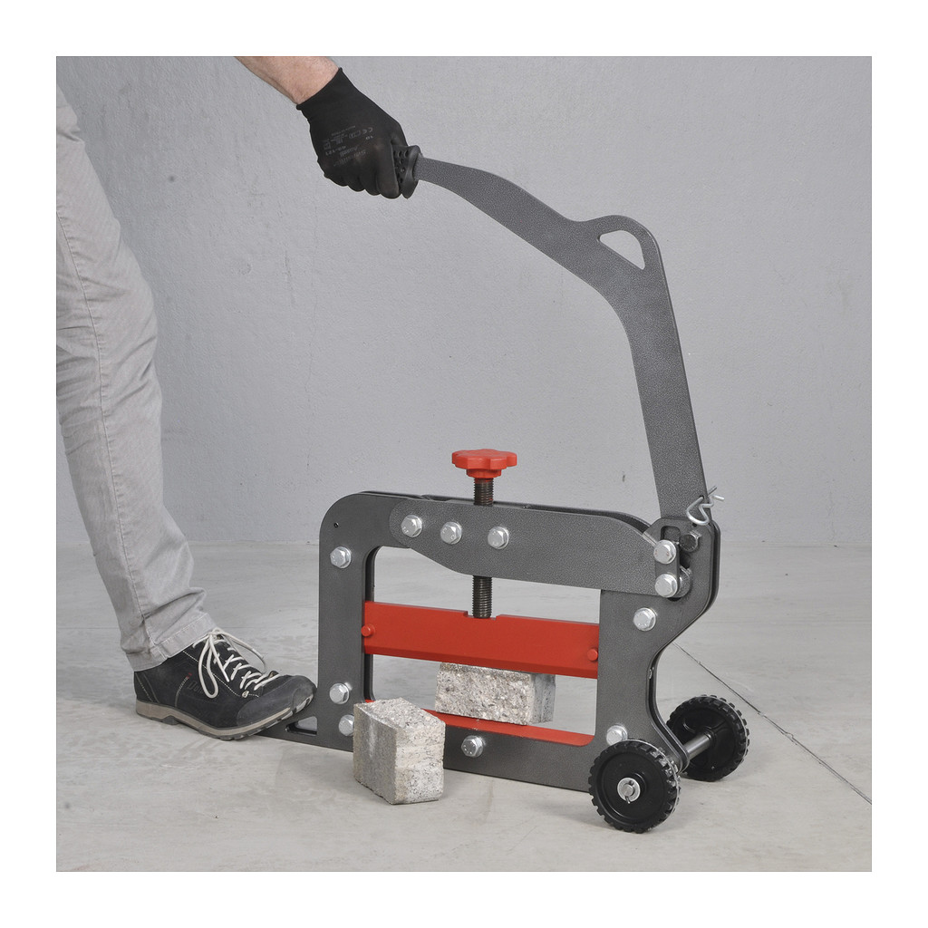 Páková lamačka na zámkovou betonovou dlažbu BLOCKUT. Délka lomu 33cm. Páková lamačka zámkové BLOCKUT, umožňuje jednoduché lámání zámkové dlažby. Výška dlažby se nastavuje aretačním šroubem. Lámání materiálů nepravidelných povrchů a tvarů umožní pohyblivé uložení horního nože na pružinách., Lamačka je opatřena pojezdovými kolečky pro snadnou ruční manipulaci a okem pro zavěšení na manipulační prostředek. Lámací nože jsou vyrobeny ze speciální zakalené oceli pro zajištění dlouhé životnosti. Na přiloženém videu je možné shlédnout pracovní postupy pro lámání.