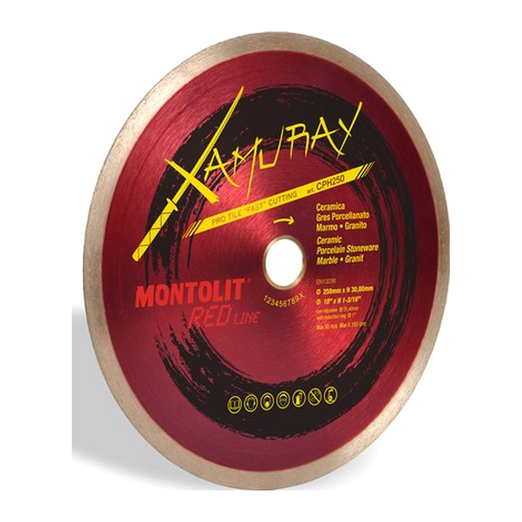 NOVINKA!! XAMURAY, celoobvodový profesionální diamantový kotouč na řezání obkladů, dlažby, slinuté dlažby, žuly, mramoru. Mokrý řez. Průměr 230 mm. Nový profesionální diamantový celoobvodový kotouč s diamantem pro rychlejší a čistší řezání. Delší životnost zajišťuje více diamantu v prstenci, výška diamantového prstence je 10 mm. Diamantový prstenec se při řezání keramiky časem zanáší kalem a může se chovat, jako když je tupý a neřeže nebo řeže pomalu. Pro vyčištění a oživení kotouče lze použít čistící brus 395B, který kotouč ošetří, nabrousí ostří a prodlouží jeho životnost. Nevíte si rady s výběrem správného diamantového celoobvodového kotouče? Na přiloženém souboru ke stažení naleznete pár rad, které Vám mohou při výběru pomoci.