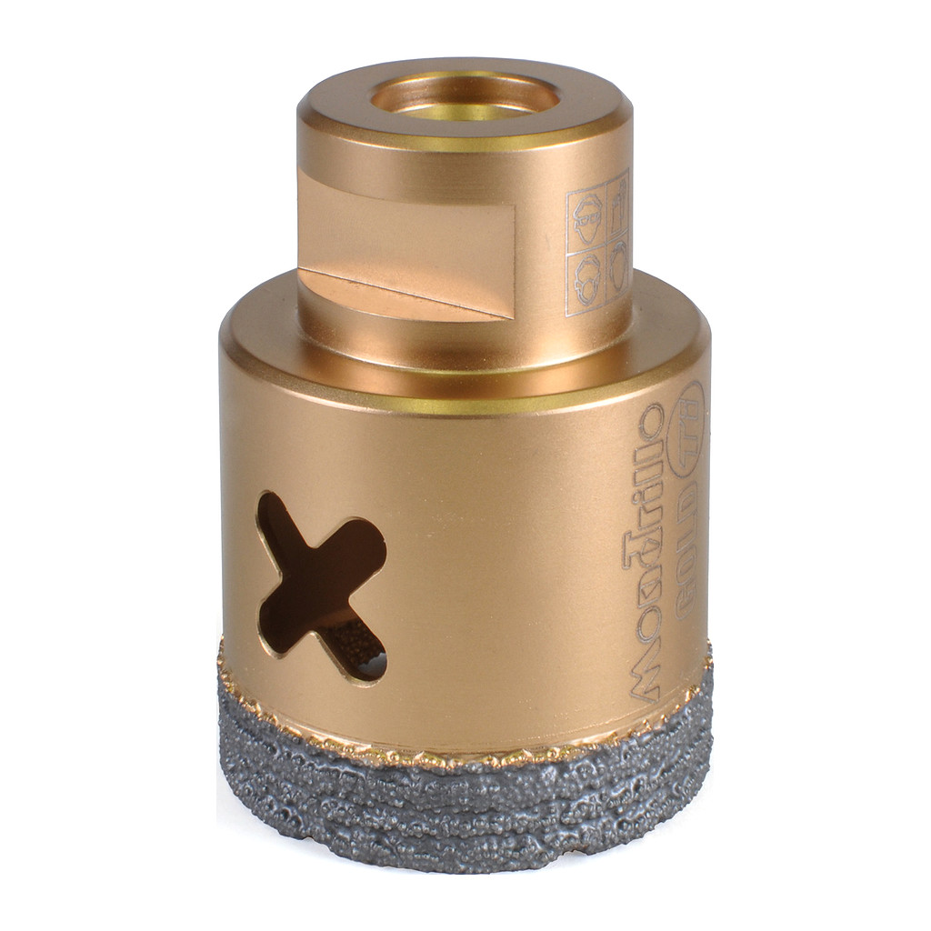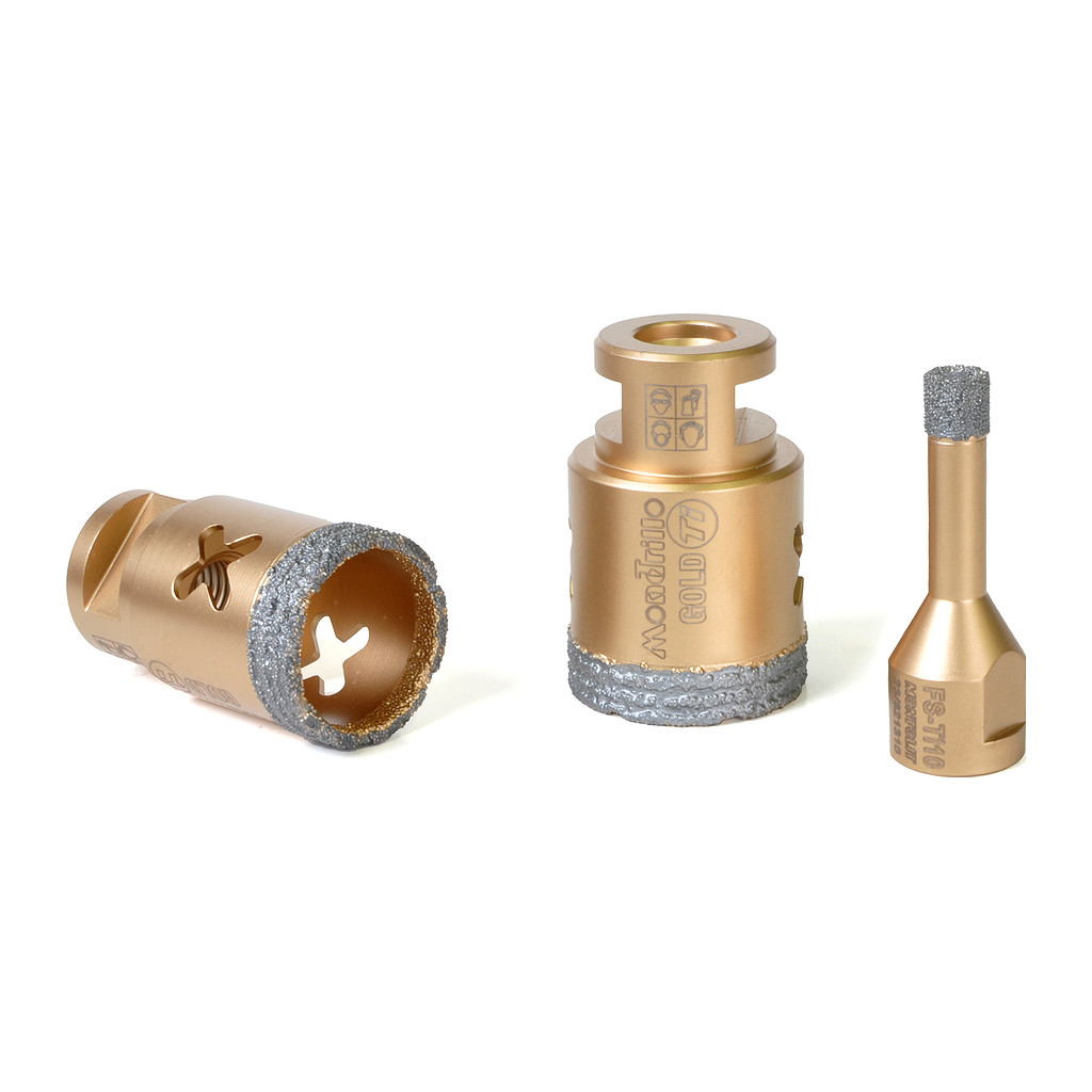 Rychlé vrtání za sucha i mokra do tvrdých dlažeb, keramiky, kámene a obkladu. Průměr 45 mm. Ideální pomocník pro obkladače, elektrikáře a instalatéry. Do úhlové brusky. Novinka 2024 – korunky zlaté řady FS-TI Mondrillo X Titanium gold nahradila předchozí řadu Modrillo FS (modré). Ve srovnání s předchozí generací FS má tělo z titanu a nové uspořádání diamantových zrn, což prodlužuje životnost a zvyšuje výkon až o 30 %. Korunky jsou určeny na rychlé vrtání do tvrdých materiálů. Upevňují se přímo do úhlové brusky. Speciální spirálový tvar diamantového prstence zajišťuje vyšší rychlost a delší životnost ve srovnání s podobnými běžnými korunkami. Pro urychlení vrtání a zvýšení životnosti se doporučuje korunky při vrtání ochlazovat ponořením do studené vody a po celou dobu vrtat krouživým pohybem. Pozor! Korunka po obroušení diamantu nevrtá, i když stále vypadá jako nová!! Na přiloženém videu je možné shlédnout pracovní postupy pro vrtání se starší generací Mondrillo FS. Videou s FS-TI připravujeme.