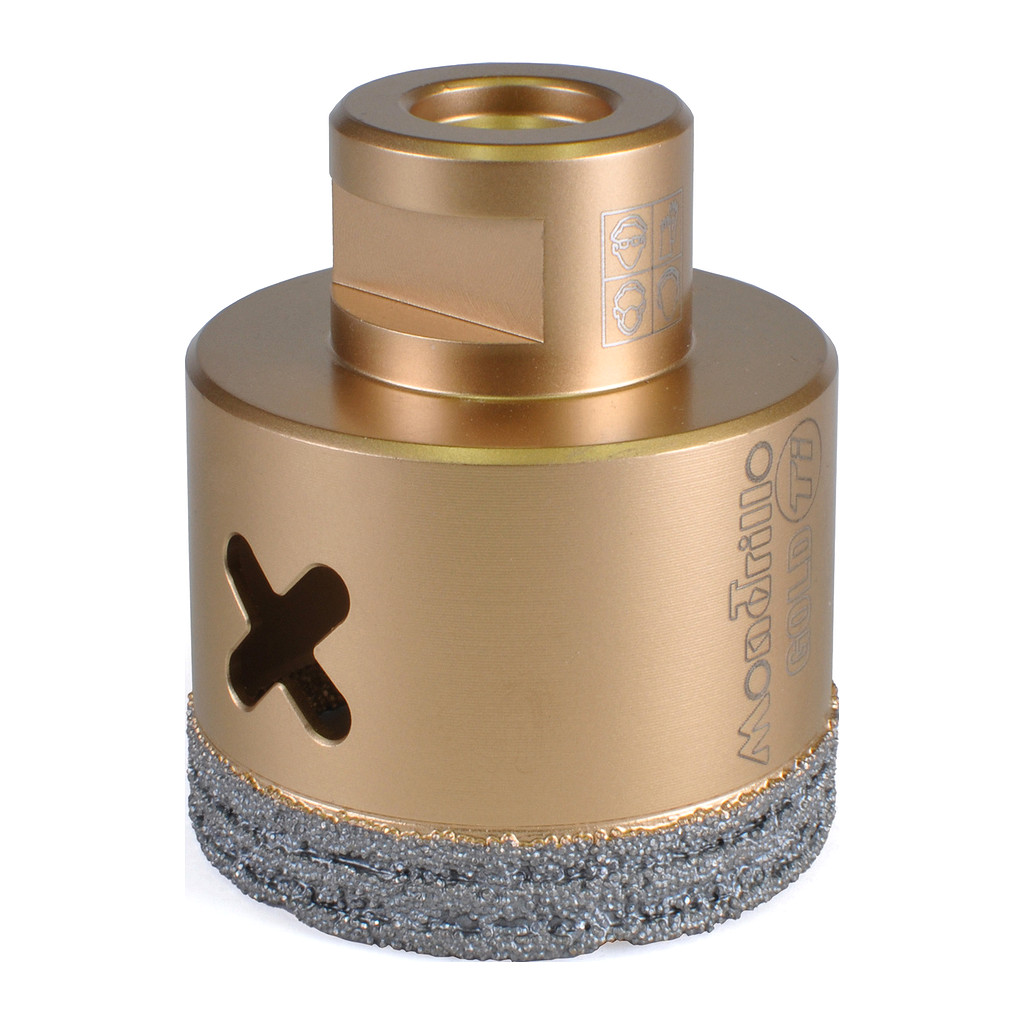 Rychlé vrtání za sucha i mokra do tvrdých dlažeb, keramiky, kámene a obkladu. Průměr 55 mm. Ideální pomocník pro obkladače, elektrikáře a instalatéry. Do úhlové brusky. Novinka 2024 – korunky zlaté řady FS-TI Mondrillo X Titanium gold nahradila předchozí řadu Modrillo FS (modré). Ve srovnání s předchozí generací FS má tělo z titanu a nové uspořádání diamantových zrn, což prodlužuje životnost a zvyšuje výkon až o 30 %. Korunky jsou určeny na rychlé vrtání do tvrdých materiálů. Upevňují se přímo do úhlové brusky. Speciální spirálový tvar diamantového prstence zajišťuje vyšší rychlost a delší životnost ve srovnání s podobnými běžnými korunkami. Pro urychlení vrtání a zvýšení životnosti se doporučuje korunky při vrtání ochlazovat ponořením do studené vody a po celou dobu vrtat krouživým pohybem. Pozor! Korunka po obroušení diamantu nevrtá, i když stále vypadá jako nová!! Na přiloženém videu je možné shlédnout pracovní postupy pro vrtání se starší generací Mondrillo FS. Videou s FS-TI připravujeme.