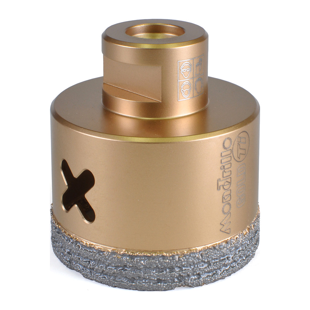 Rychlé vrtání za sucha i mokra do tvrdých dlažeb, keramiky, kámene a obkladu. Průměr 60 mm. Ideální pomocník pro obkladače, elektrikáře a instalatéry. Do úhlové brusky. Novinka 2024 – korunky zlaté řady FS-TI Mondrillo X Titanium gold nahradila předchozí řadu Modrillo FS (modré). Ve srovnání s předchozí generací FS má tělo z titanu a nové uspořádání diamantových zrn, což prodlužuje životnost a zvyšuje výkon až o 30 %. Korunky jsou určeny na rychlé vrtání do tvrdých materiálů. Upevňují se přímo do úhlové brusky. Speciální spirálový tvar diamantového prstence zajišťuje vyšší rychlost a delší životnost ve srovnání s podobnými běžnými korunkami. Pro urychlení vrtání a zvýšení životnosti se doporučuje korunky při vrtání ochlazovat ponořením do studené vody a po celou dobu vrtat krouživým pohybem. Pozor! Korunka po obroušení diamantu nevrtá, i když stále vypadá jako nová!! Na přiloženém videu je možné shlédnout pracovní postupy pro vrtání se starší generací Mondrillo FS. Videou s FS-TI připravujeme.