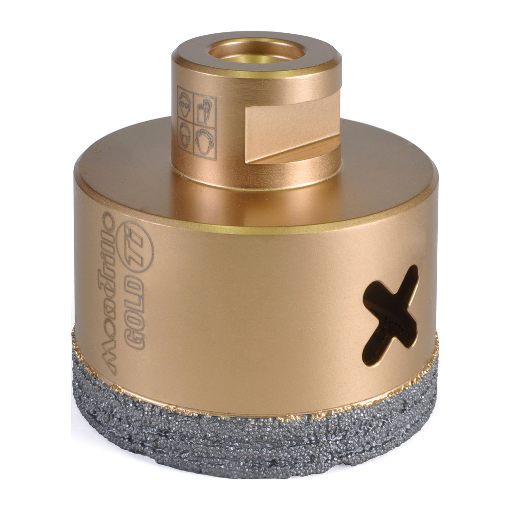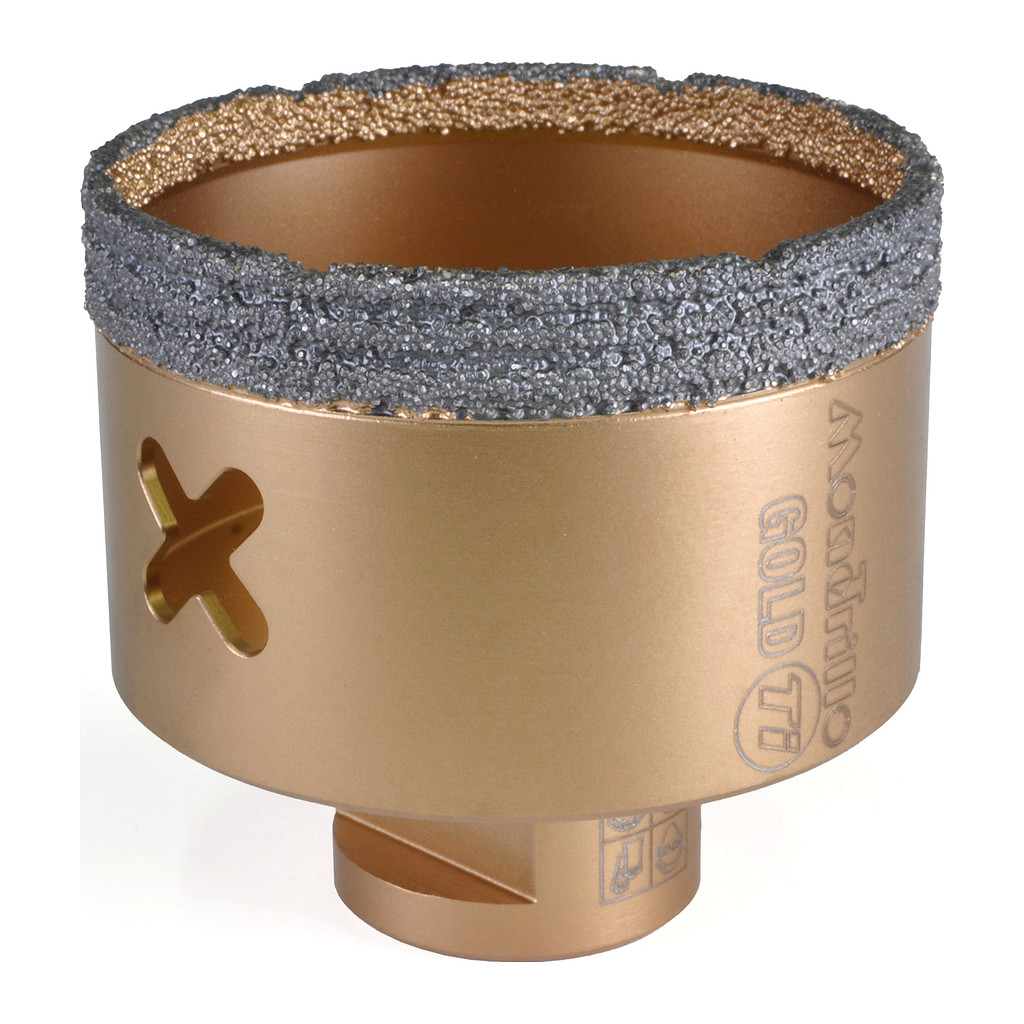 Rychlé vrtání za sucha i mokra do tvrdých dlažeb, keramiky, kámene a obkladu. Průměr 65 mm. Ideální pomocník pro obkladače, elektrikáře a instalatéry. Do úhlové brusky. Novinka 2024 – korunky zlaté řady FS-TI Mondrillo X Titanium gold nahradila předchozí řadu Modrillo FS (modré). Ve srovnání s předchozí generací FS má tělo z titanu a nové uspořádání diamantových zrn, což prodlužuje životnost a zvyšuje výkon až o 30 %. Korunky jsou určeny na rychlé vrtání do tvrdých materiálů. Upevňují se přímo do úhlové brusky. Speciální spirálový tvar diamantového prstence zajišťuje vyšší rychlost a delší životnost ve srovnání s podobnými běžnými korunkami. Pro urychlení vrtání a zvýšení životnosti se doporučuje korunky při vrtání ochlazovat ponořením do studené vody a po celou dobu vrtat krouživým pohybem. Pozor! Korunka po obroušení diamantu nevrtá, i když stále vypadá jako nová!! Na přiloženém videu je možné shlédnout pracovní postupy pro vrtání se starší generací Mondrillo FS. Videou s FS-TI připravujeme.