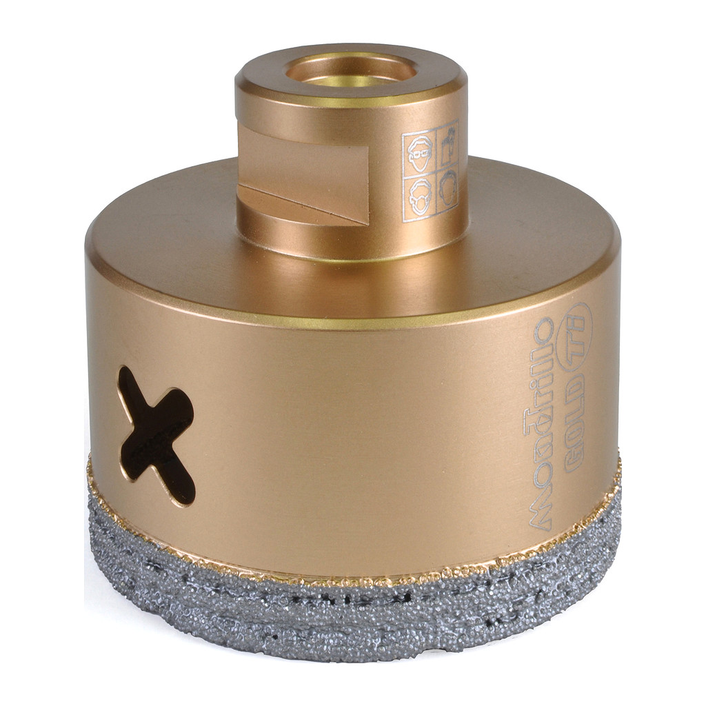 Rychlé vrtání za sucha i mokra do tvrdých dlažeb, keramiky, kámene a obkladu. Průměr 70 mm. Ideální pomocník pro obkladače, elektrikáře a instalatéry. Do úhlové brusky. Novinka 2024 – korunky zlaté řady FS-TI Mondrillo X Titanium gold nahradila předchozí řadu Modrillo FS (modré). Ve srovnání s předchozí generací FS má tělo z titanu a nové uspořádání diamantových zrn, což prodlužuje životnost a zvyšuje výkon až o 30 %. Korunky jsou určeny na rychlé vrtání do tvrdých materiálů. Upevňují se přímo do úhlové brusky. Speciální spirálový tvar diamantového prstence zajišťuje vyšší rychlost a delší životnost ve srovnání s podobnými běžnými korunkami. Pro urychlení vrtání a zvýšení životnosti se doporučuje korunky při vrtání ochlazovat ponořením do studené vody a po celou dobu vrtat krouživým pohybem. Pozor! Korunka po obroušení diamantu nevrtá, i když stále vypadá jako nová!! Na přiloženém videu je možné shlédnout pracovní postupy pro vrtání se starší generací Mondrillo FS. Videou s FS-TI připravujeme.
