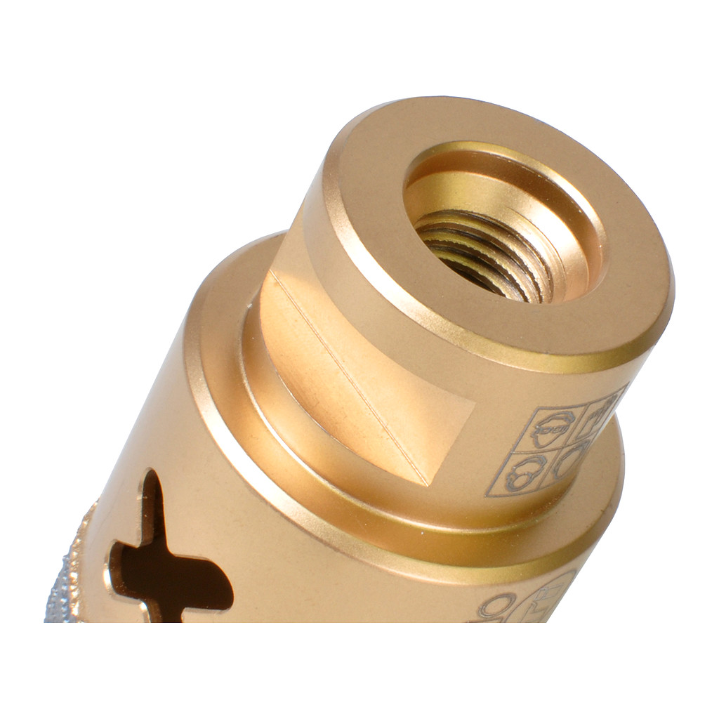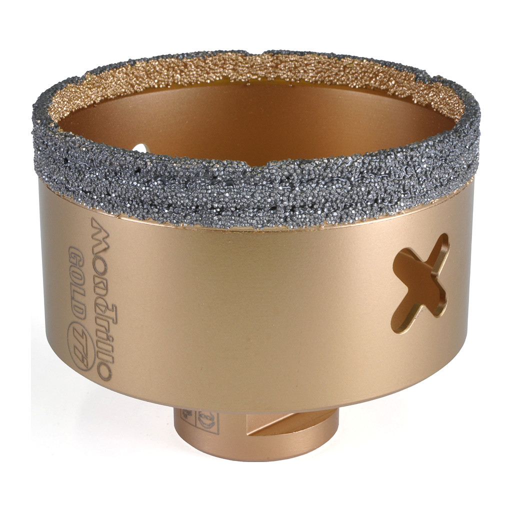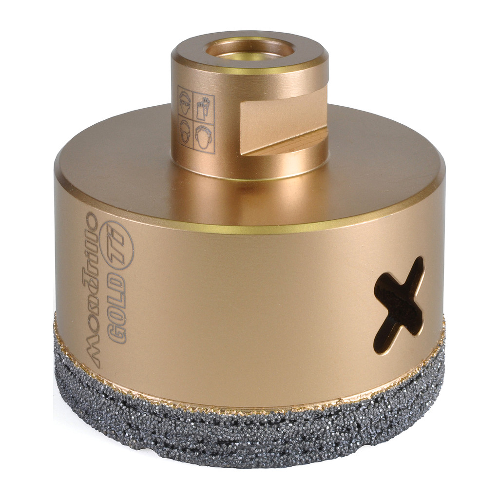 Rychlé vrtání za sucha i mokra do tvrdých dlažeb, keramiky, kámene a obkladu. Průměr 75 mm. Ideální pomocník pro obkladače, elektrikáře a instalatéry. Do úhlové brusky. Novinka 2024 – korunky zlaté řady FS-TI Mondrillo X Titanium gold nahradila předchozí řadu Modrillo FS (modré). Ve srovnání s předchozí generací FS má tělo z titanu a nové uspořádání diamantových zrn, což prodlužuje životnost a zvyšuje výkon až o 30 %. Korunky jsou určeny na rychlé vrtání do tvrdých materiálů. Upevňují se přímo do úhlové brusky. Speciální spirálový tvar diamantového prstence zajišťuje vyšší rychlost a delší životnost ve srovnání s podobnými běžnými korunkami. Pro urychlení vrtání a zvýšení životnosti se doporučuje korunky při vrtání ochlazovat ponořením do studené vody a po celou dobu vrtat krouživým pohybem. Pozor! Korunka po obroušení diamantu nevrtá, i když stále vypadá jako nová!! Na přiloženém videu je možné shlédnout pracovní postupy pro vrtání se starší generací Mondrillo FS. Videou s FS-TI připravujeme.