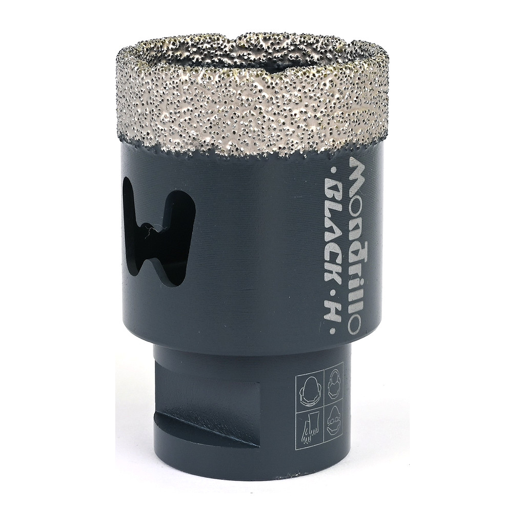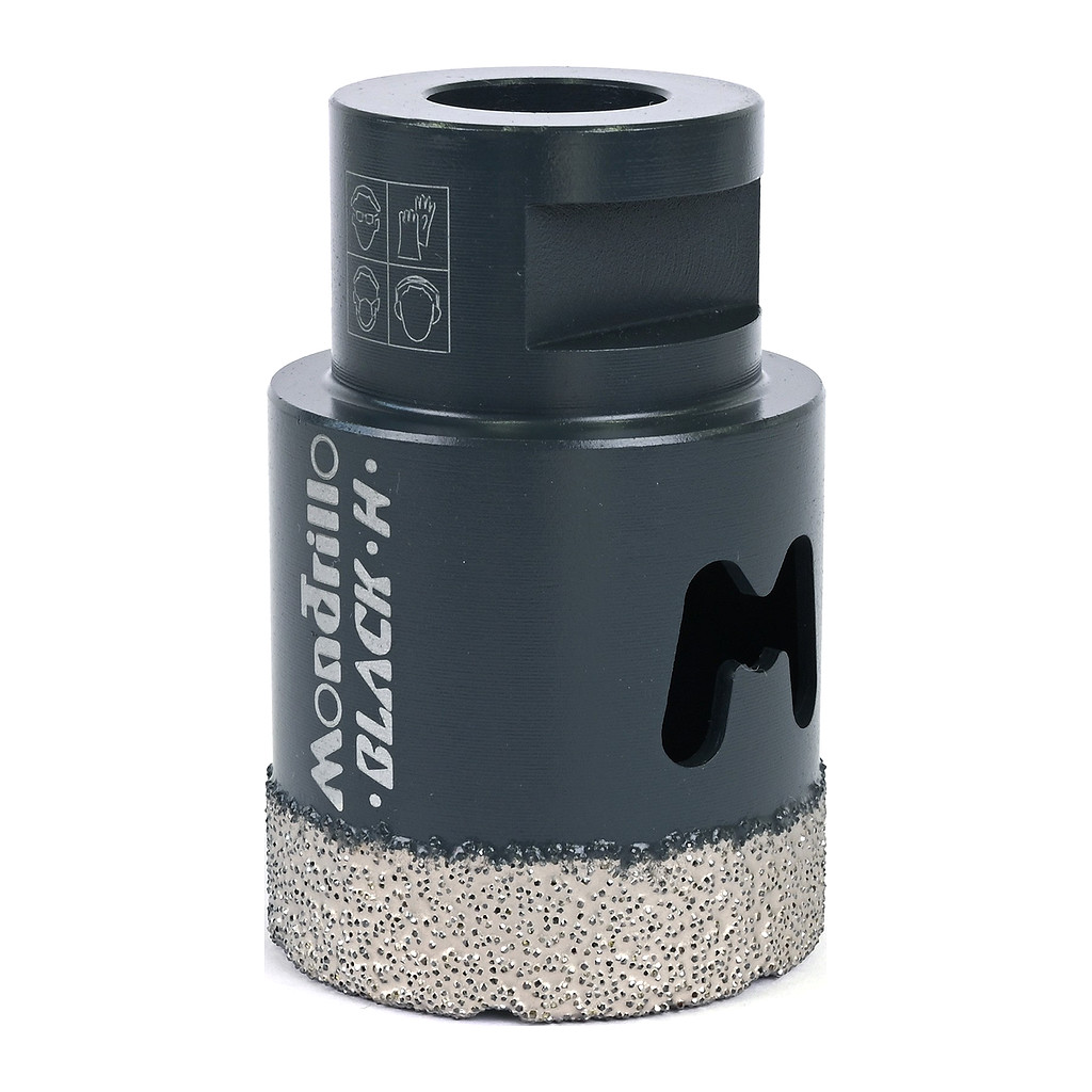Rychlé vrtání za sucha i mokra do tvrdých obkladových materiálů. Tvrdá dlažba, keramika, kámen. Průměr 40 mm. Ideální pomocník pro obkladače, elektrikáře a instalatéry. Do úhlové brusky. Nová řada FSBH je čtvrtou generací korunek FSB. Oproti předchozí generaci má vyšší vrstvu naneseného diamantu (12 mm). Korunky jsou určeny na rychlé vrtání do tvrdých materiálů. Upevňují se přímo do úhlové brusky (závit M14). Korunka FSBH40 ve verzi Black od italského výrobce Montolit je ekonomickou verzí korunky Mondrillo FS-TI40. Pro urychlení vrtání a zvýšení životnosti se doporučuje při práci přerušit vrtání a ponořit korunku do vody. Následně pokračovat ve vrtání a opakovat chlazení, tak aby nedošlo k přehřátí diamantové části korunky a jejímu spálení. POZOR!! Pro docílení uvedené životnosti korunky je nezbytné po celou dobu vrtat krouživým pohybem, aby nedošlo k rychlému opotřebení diamantu na hraně prstence. Nevrtat kolmo jako s běžným vrtákem!!!!!! Pozor! Korunka po obroušení diamantu nevrtá, i když stále vypadá jako nová!! Na přiloženém videu je možné shlédnout pracovní postupy pro vrtání.