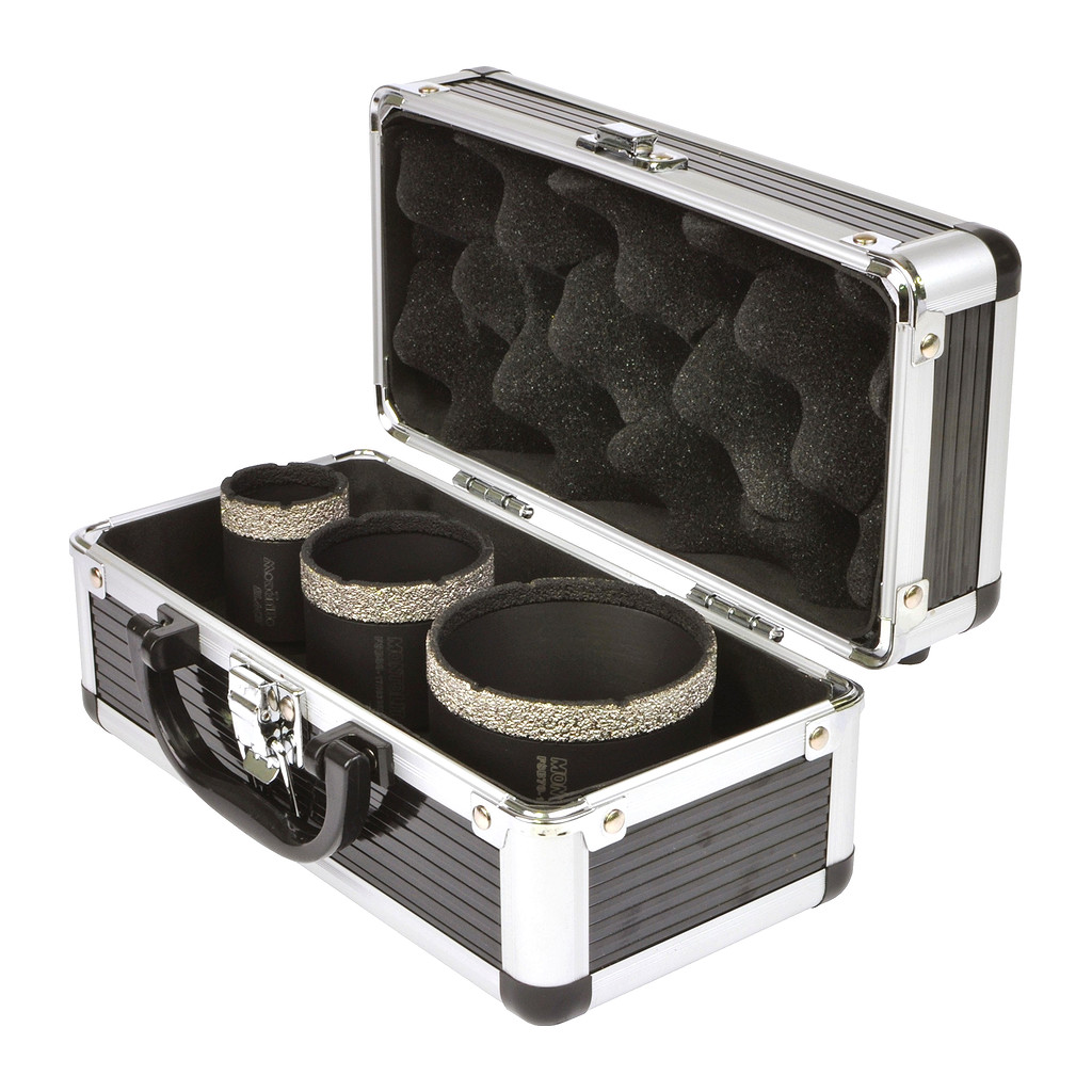 Sada korunek 30, 50, 70 mm, rychlé vrtání za sucha i mokra do tvrdých obkladových materiálů. Tvrdá dlažba, keramika, kámen. S praktickým kufříkem. Ideální pomocník pro obkladače, elektrikáře a instalatéry. Do úhlové brusky. Korunky jsou určeny na rychlé vrtání do tvrdých materiálů. Upevňují se přímo do úhlové brusky. Sada korunek FSBKIT-CZ/SK Mondrillo ve verzi Black od italského výrobce Montolit je vyrobena pro Českou a Slovenskou republiku. Sada obsahuje tři frézy do úhlové brusky v průměrech 35, 50 a 70 mm, které byly zvoleny pro potřebu českého a slovenského zákazníka. Frézky jsou dodávány včetně kvalitního a odolného kufříku, který zajistí ochranu při transportu. V případě potřeby je možné zakoupit samostatně frézu FSB 35, frézu FSB 50 a frézu FSB 70. Pro zvýšení životnosti se doporučuje korunky při vrtání ochlazovat ponořením do studené vody, po celou dobu vrtat krouživým pohybem. Využijte akční nabídky a kupte si sadu FSBKIT-CZ/SK s frézou FPU 20 pro zvětšování otvorů se 40 % slevou. Pozor! Korunka po obroušení diamantu nevrtá, i když stále vypadá jako nová!! Na přiloženém videu je možné shlédnout pracovní postupy pro vrtání.