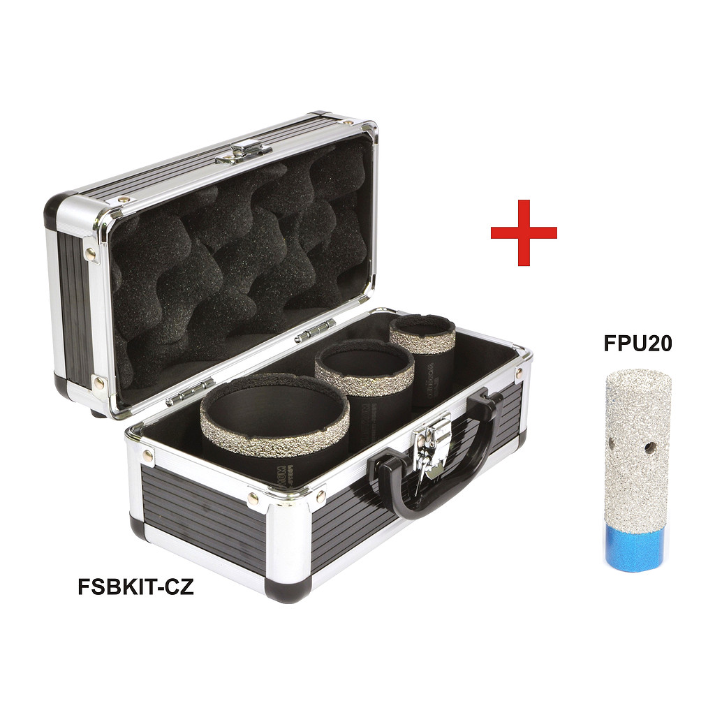 Rychlé vrtání za sucha i mokra do tvrdých obkladových materiálů. Tvrdá dlažba, keramika, kámen. Sada fréz 35, 50 a 70 mm s praktickým kufříkem a frézou pro zvětšování děr FPU20 se 40 % slevou. Ideální pomocník pro obkladače, elektrikáře a instalatéry. Do úhlové brusky. Korunky jsou určeny na rychlé vrtání do tvrdých materiálů. Upevňují se přímo do úhlové brusky. Sada korunek FSBKIT-CZ/SK ve verzi Black od italského výrobce Montolit je vyrobena pro Českou s Slovenskou Republiku. Sada obsahuje tři frézy do úhlové brusky, jejichž velikosti 35, 50 a 70 mm byly zvoleny dle potřeb českého a slovenského zákazníka. Frézky jsou dodávány včetně kvalitního a odolného kufříku, který zajistí ochranu při transportu. Navíc je k této sadě fréza FPU 20 pro zvětšování děr se 40 % slevou. V případě potřeby je možné zakoupit samostatně frézu FSB 35, frézu FSB 50 a frézu FSB 70. Pro zvýšení životnosti se doporučuje korunky při vrtání ochlazovat ponořením do studené vody, po celou dobu vrtat krouživým pohybem. Sadu FSBKIT-CZ/SK můžete objednat také bez frézy FPU 20 zde. Pozor! Korunka po obroušení diamantu nevrtá, i když stále vypadá jako nová!! Na přiloženém videu je možné shlédnout pracovní postupy pro vrtání.