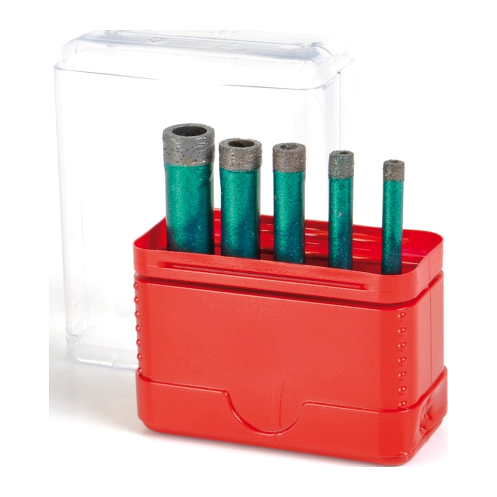 Sada diamantových korunek Killer Junior pro vrtání za sucha. Průměry 5, 6, 8, 10, 12 mm. Vhodné na připevňování zařizovacích předmětů, světel, věšáků do již položených obkladů, dlažky, kamene. Vrtání za sucha. Pro zvýšení trvanlivosti korunky a zrychlení vrtání se doporučuje pravidelné zchlazování frézy vodou během vrtání. Výrobce doporučuje používat při vrtání s korunkami chladící a ochranný přípravek M-PERFORMER, do kterého se během vrtání fréza namočí. Na přiloženém videu je možné shlédnout pracovní postupy pro vrtání. Na přiloženém videu je možné shlédnout kolik otvorů lze vyvrtat frézou FTJ.