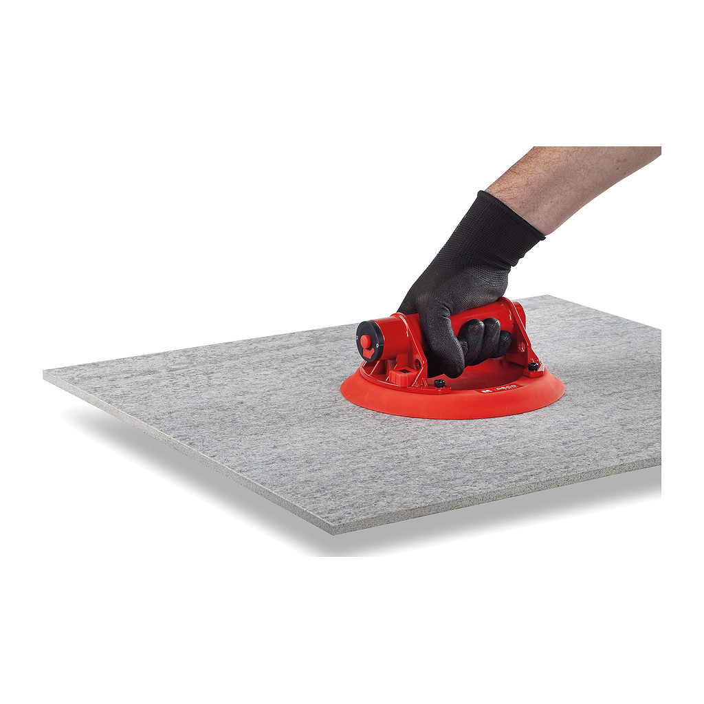 GECO e-power, automatická elektrická přísavka s průměrem 200 mm na dlažbu a obklady. Nosnost 100 kg. Přísavka je určena k manipulaci s robustnějšími dlaždicemi (velkoformátové dlaždice nebo vyšší dlažba tloušťky 2 cm). Usnadňuje usazování dlaždic, jejich manipulaci a umožňuje zpětné vyjmutí usazené dlaždice nebo její posunutí a to bez poškození okolních dlaždic. Velký průměr přísavky 200 mm a silný podtlak zajistí dostatečný tlak a sílu pro manipulaci. I přes svou velmi malou hmotnost 0,93 kg má maximální nosnost 100 kg. Přísavná plocha je vyrobena z velmi jemné a pružné červené gumy, která se dobře přichytí na povrchu přenášeného materiálu a nezanechává čmouhy. Lze s ní přenášet nejen hladké materiály, ale také se přichytí na většině reliéfních dlažeb (venkovní keramické 2 cm dlažby). Přísavka se umistí na přenášený materiál a spustí se pomocí tlačítka na boku rukojeti. Dojde k odsávání vzduchu pod gumovou přísavnou plochou. U reliéfního povrchu doporučujeme na přísavku lehce přitlačit, aby se guma zatlačila do reliéfu a došlo k přisátí. Po přisátí se přísavka sama natlakuje na požadovaný podtlak, který lze kontrolovat na displeji a v případě jeho poklesu dojde ihned automaticky k jeho dorovnání. Po vypnutí přísavky vypínačem na boku rukojeti se pomocí vypouštěcího ventilu na druhé straně rukojeti vyrovná tlak a přísavku lze sundat z přenášeného materiálu. Okraje přísavné plochy jsou opatřeny pětinásobnou barierou pro lepší přilnutí na dlažby s reliéfním povrchem. Přísavka je napájena Li-ion baterií a úroveň jejího nabití je možné kontrolovat na displeji. Baterie je umístěna v rukojeti přísavky a její dobíjení je pomocí USB-C konektoru (použití např u většiny mobilních telefonů). Součástí balení je kabel USB-C / USB (neobshuje nabíječku). Přísavka je dodávána včetně plastového krytu, který zajištuje ochranu gumové přísavné plochy při převážení. Je důležité udržovat přísavnou plochu čistou a chránit ji před poškozením nebo otlačením. Zaprášená plocha přísavky i dlažby může snížit účinek přísavky a prach může zanechat na dlažbě obrys, který později bývá těžké odstranit. Použít také na manipulaci se sklem, kovem, plastem a jiným materiálem s rovným povrchem. Na následujícím videu můžete vidět použití přísavky GECO e-power: