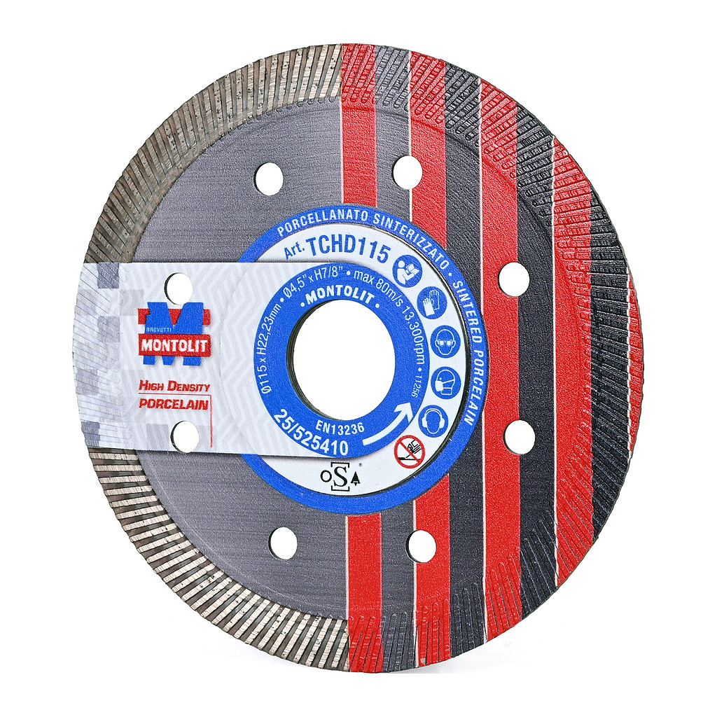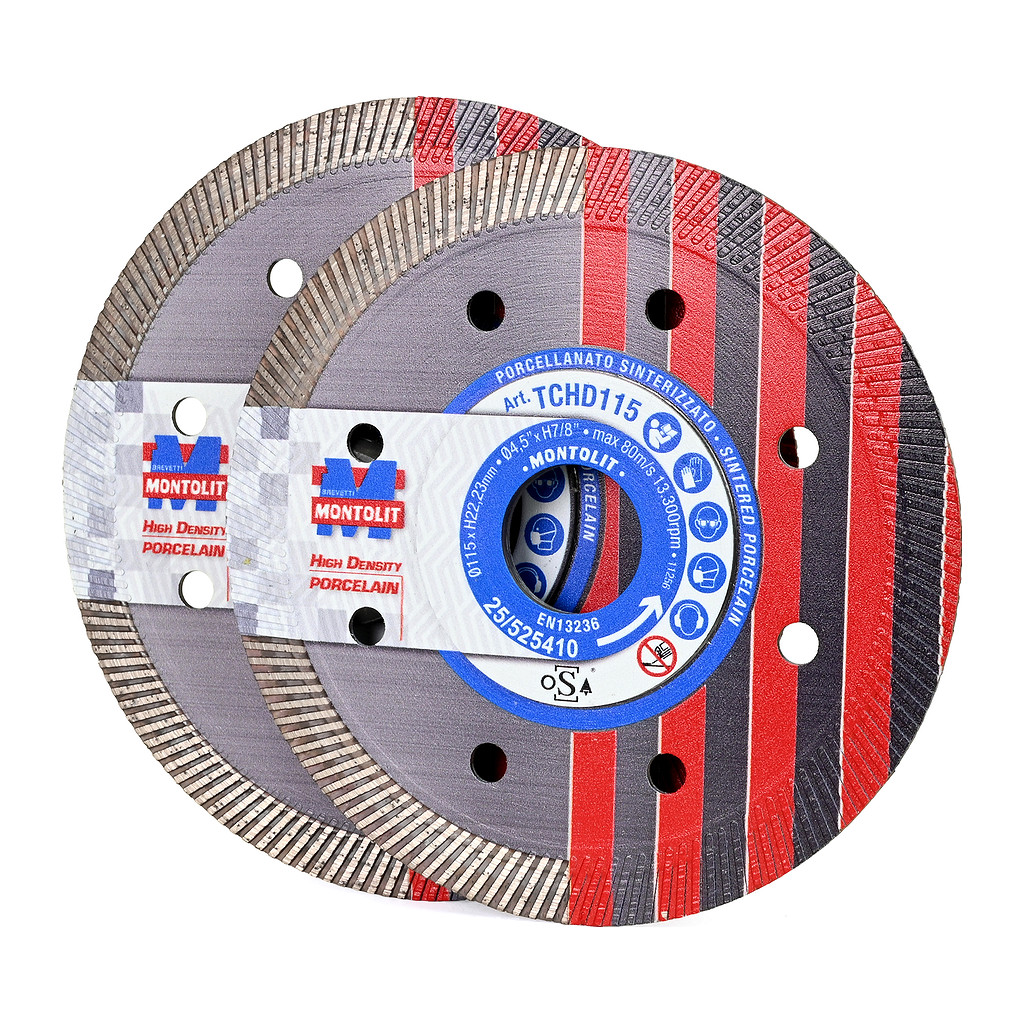 Profesionální diamantový kotouč na řezání tvrdé keramiky, porcelánu a slinuté dlažby s vysokou hustotou, do tloušťky až 2 cm. Tenký diamantový kotouč TCHD125 je vyvinut na rychlé řezání dlaždic z keramiky/porcelánu s vysokou hustotou (např Dekton, Lapitec) bez nutnosti chlazení vodou. Jedná se především o materiály, které jsou vyrobeny pod vysokým tlakem a vysokou teplotou ve srovnání s dlaždicemi, které se vyrábí standartním postupem. Jemný, hustě (kompaktně) rozmístěný turbo prstenec koutouče TCHD zajišťuje rychlé řezání a efektivní chlazení při řezání nejvrdších materiálů. Je také vhodný pro řezání slinuté keramiky až do tloušťky 2 cm, přirodní žuly, tvrdého přírodního kamene a umělého syntetického kamene. Kotouč je ve středu (jádru kotouče) zesílen pro lepší uchycení do úhlové brusky a tím zajištění stabilního výkonu při řezání.. Provádění řezů dlažby a kamene pomocí úhlové brusky a diamantových kotoučů bývá často velmi náročné a namáhavé, především udržení rovnosti a přesnosti řezu. Firma MONTOLIT přináší jednoduché řešení – revoluční nástroj pro obkladače TUTORCUT 125-U. Na videu můžete vidět použití kotouče TCHD.