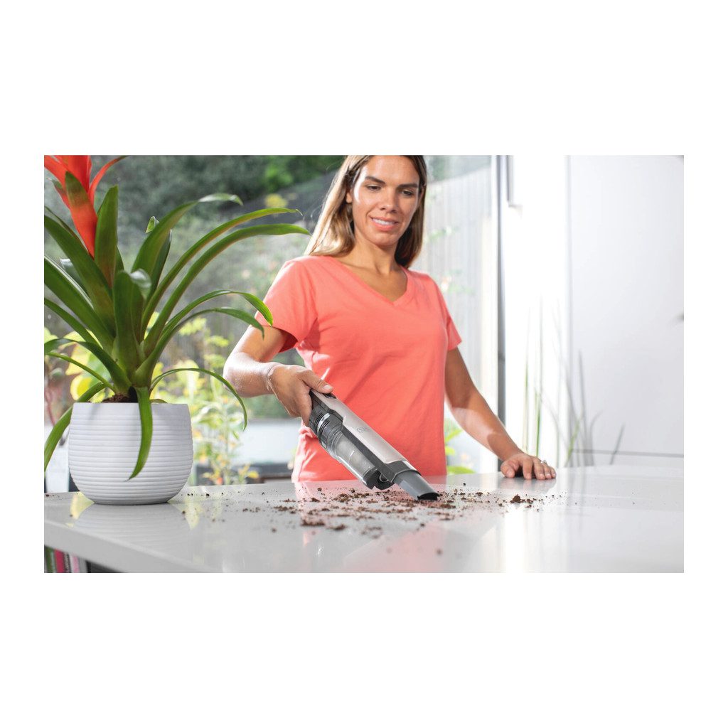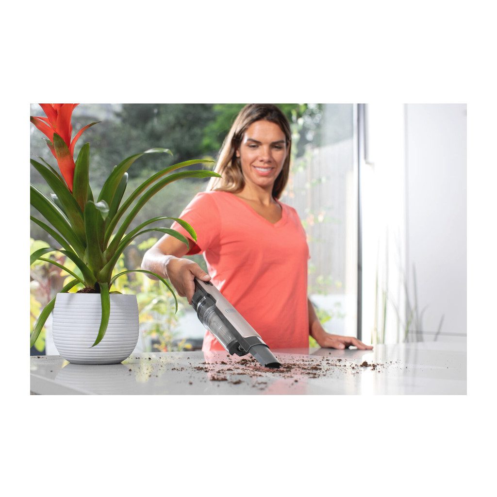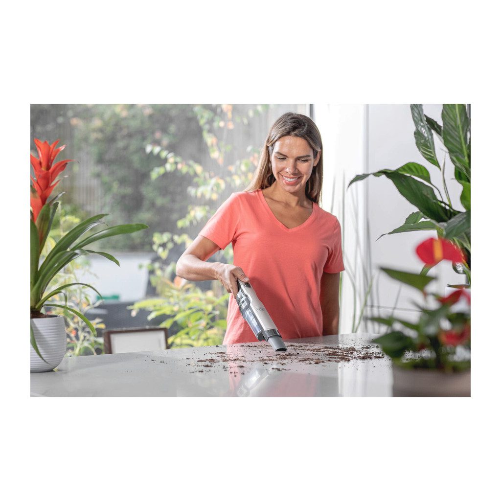 Aku ručný vysávač BLACK+DECKER je tichý. Vysáva dôkladne s dlhšou dobou chodu bez straty výkonu. Tenký, ergonomický dizajn ponúka jednoduchú manipuláciu s maximálnym komfortom a je ideálny na čistenie ťažko dostupných miest. 2 úrovne sania vám umožňujú prispôsobiť sací výkon vašim úlohám – nízka úroveň na odstraňovanie nečistôt v každodennom živote a vysoká úroveň na odstraňovanie odolných nečistôt. Priehľadná nádoba na nečistoty ponúka jednoduché vyprázdnenie stlačením tlačidla, aby sa zabránilo kontaktu s nečistotami. Jednoduché čistenie filtrov zaisťuje nepretržitý maximálny výkon.