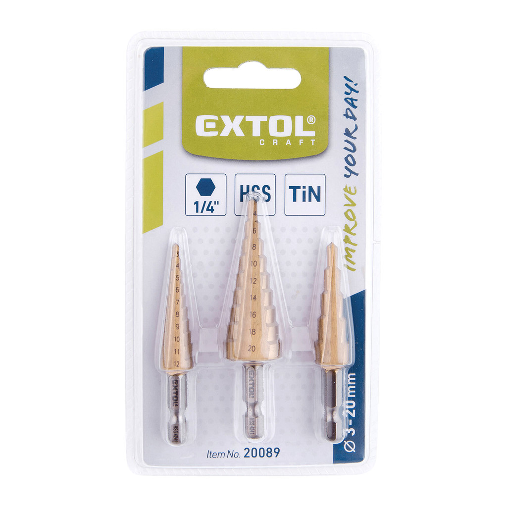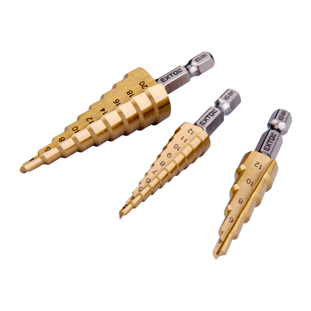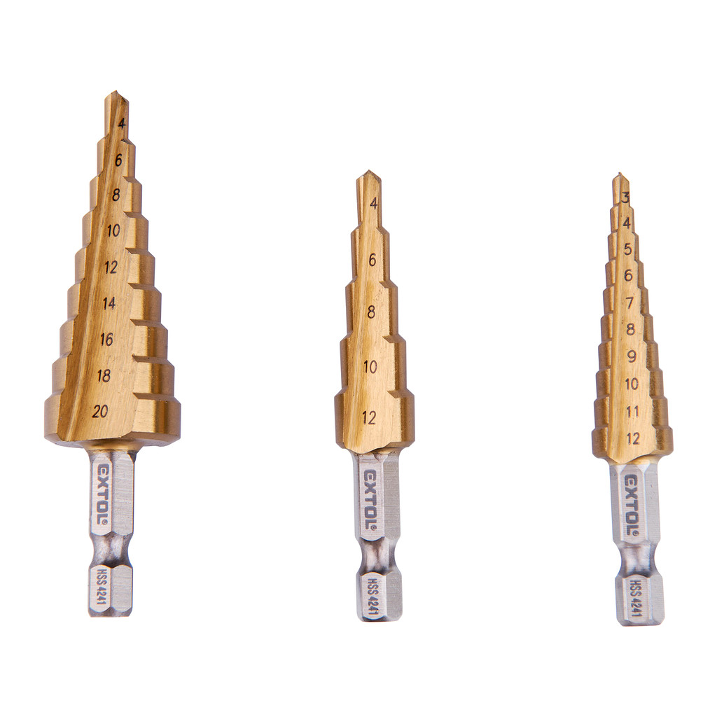 Domov » EXTOL CRAFT 20089 – Vrtáky stupňovité, sada 3ks, ø3-12/1mm, ø4-12/2mm, ø4-20/2mm