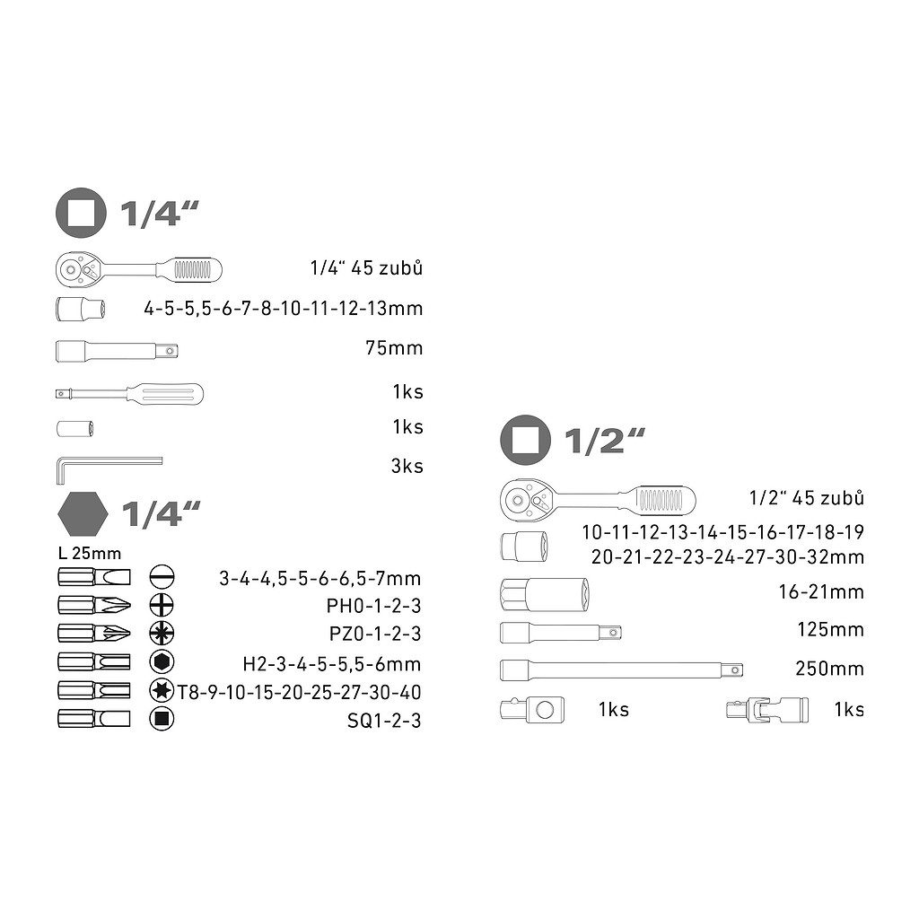 • Hlavice nástrčné: 1/4″: 4-5-5,5-6-7-8-10-11-12-13mm, 1/2″: 10-11-12-13-14-15-16-17-18-19-20-21-22-23-24-27-30-32mm