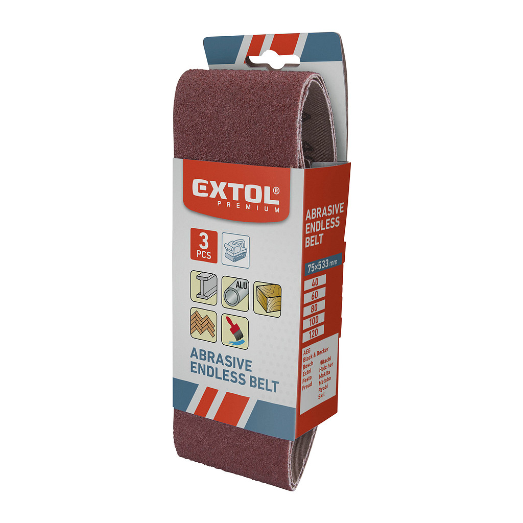 Domov » Náradie » Príslušenstvo » Brúsne mriežky, pásy a papiere » Brúsne pásy » 533 x 76 mm » Extol Premium 8803524 – Pás brúsny, korund 3ks, 533x76mm, P40