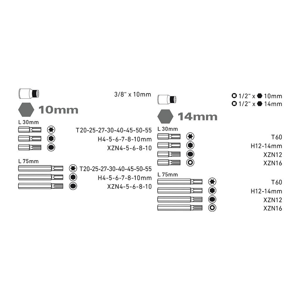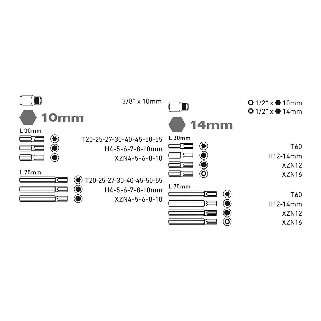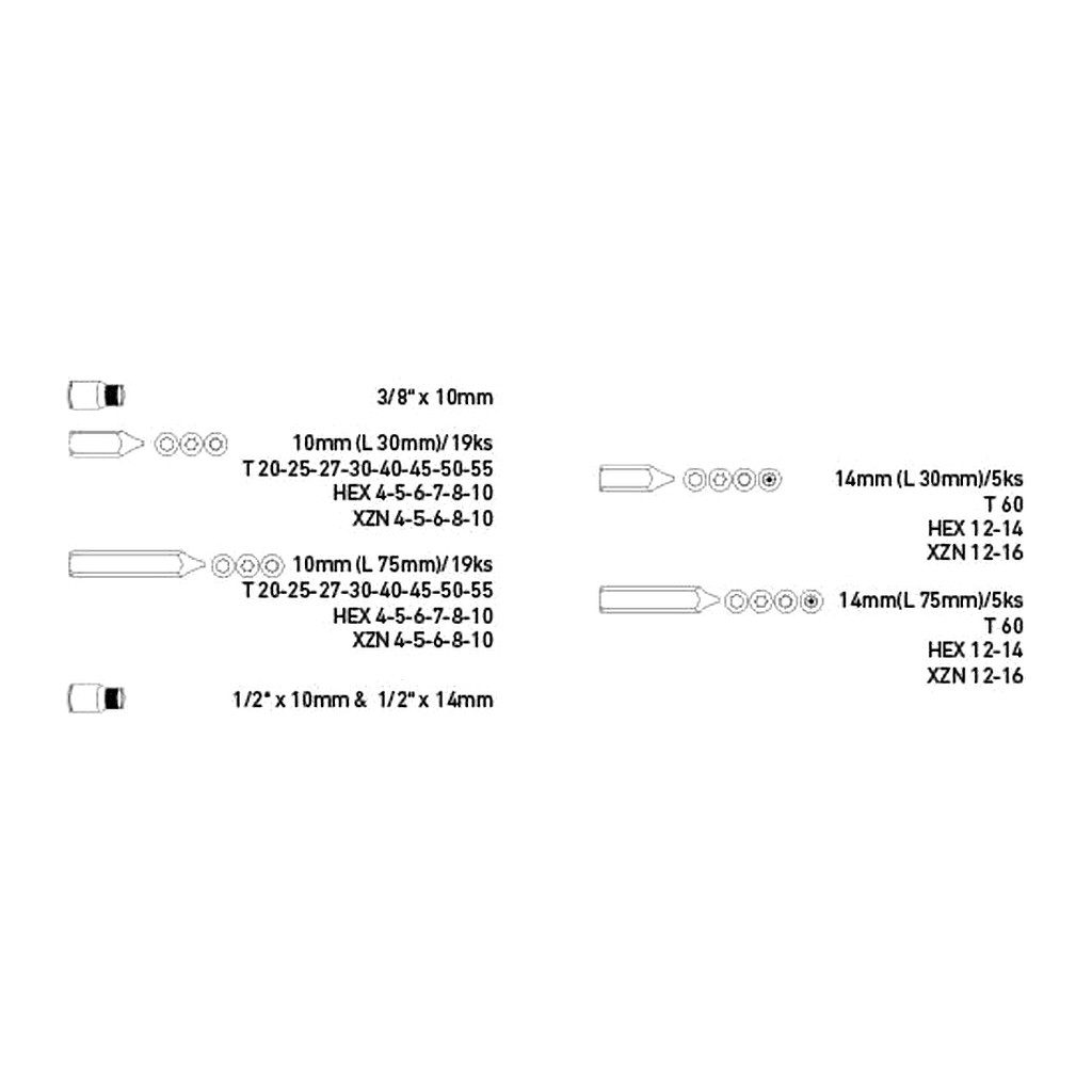 • Hlavice zástrčné: bity zástrčné 10mm(L30mm):T20-25-27-30-40-45-50-55, H4-5-6-7-8-10mm, XZN4-5-6-8-10; 14mm(L30mm): T60, H12-14mm, XZN12, XZNTa16