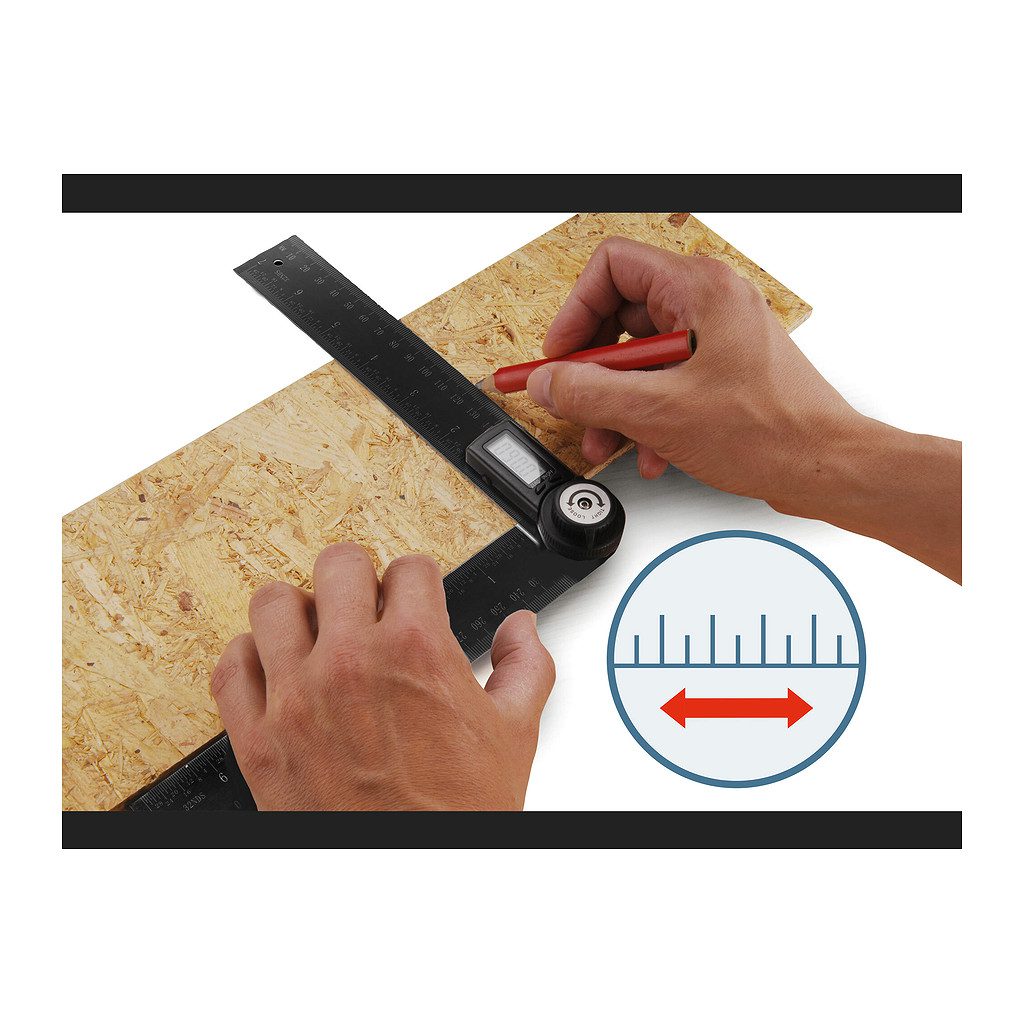 • Doplňujúci parameter: dĺžka 200mm, rozsah merania 0°-360°, presnosť ±0,3°, rozlíšenie 0,1°, pravítko (dĺžka x šírka) 400mm x 35mm, 4-miestny LCD displej, napájanie: 1x 3V batéria typ CR2032, materiál: antikoro, automatické vypnutié po 6 min. nečinnosti, možnosť uzamknutia v nastavenom uhle