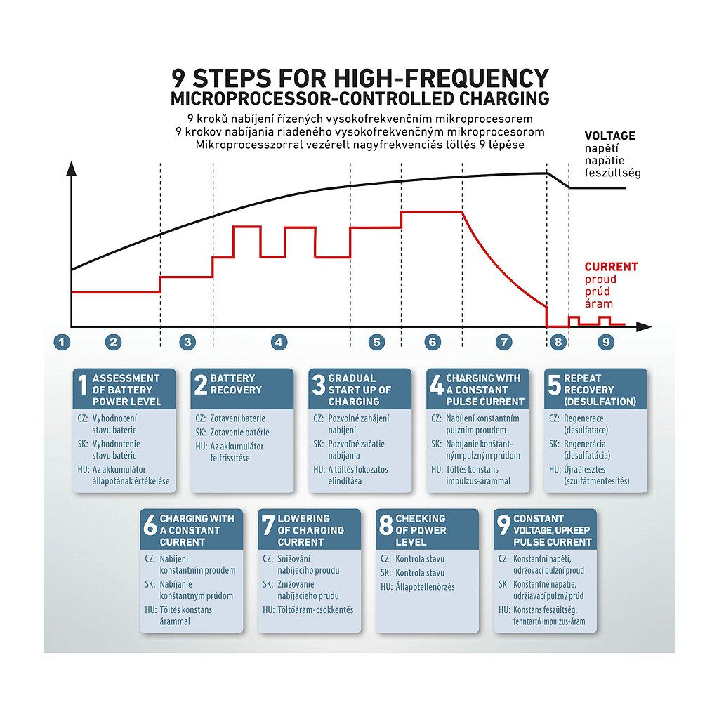 Nabíjačka je určená pre nabíjanie 12V alebo 6V olovených akumulátorov so zaplavenou elektródou WET aj Calcium, MF VRLA akumulátorov, AGM aj gélových akumulátorov, v rozsahu menovitej kapacity batérií 20 – 160Ah. Pre svoju prácu využíva automatický prepínací mód s vysokou frekvenciou. Vstavaný mikroprocesor v naprogramovaných 9 fázach procesu zaistí nabitie batérií až do 100% ich originálnej kapacity. Umožňuje automaticky (alebo voliteľne) znovuoživenie čiastočne sulfátových batérií. Nabíja a zachraňuje vyčerpané batérie. V automatickom udržiavacím móde dodáva batériám iba toľko potrebnej energie, ktorá sa rovná jej samovybíjaciemu prúdu, takže umožní užívateľovi ponechať batériu spojenú s nabíjačkou aj po niekoľko mesiacov a udržať ju v stále plnom stave nabitia. Ďalšie funkcie: – funkcia regenerácie hlboko vybitého akumulátora – ochrana proti prepólovaniu, iskreniu a skratu – ochrana proti prebíjaniu – zachovanie nastavenia pri výpadku prúdu – regulácia nabíjacieho prúdu v chladnom prostredí – možnosť dobíjanie cez 12V zásuvku. 9 nabíjacích stupňov: 1-vyhodnotenie stavu batérie, 2-zotavenie batérie, 3-pozvoľné začatie nabíjania, 4-nabíjanie konštantným pulzným prúdom, 5-regenerácia (desulfatácia), 6-nabíjanie konštantným prúdom, 7-znižovanie nabíjacieho prúdu, 8-kontrola stavu, 9-konštantné napätie, udržiavacia pulzný prúd.“