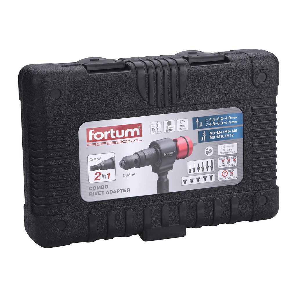 Domov » Náradie » Príslušenstvo » Pre nitovacie kliešte » Nadstavce » Fortum 4770667 – Nadstavec na nitovanie 2v1, nity 2,4-6,4mm, matice M3-M12