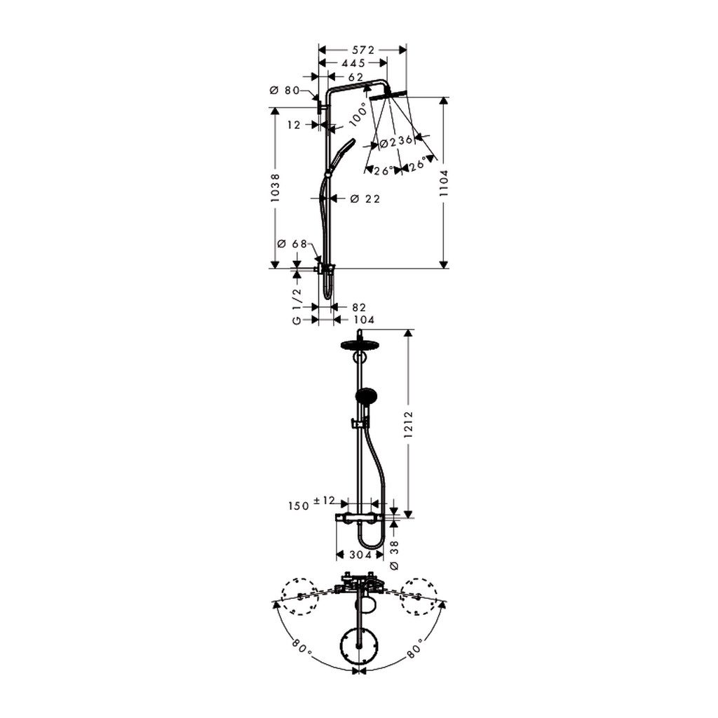 • Dĺžka sprchového ramena hlavovej sprchy: 460 mm