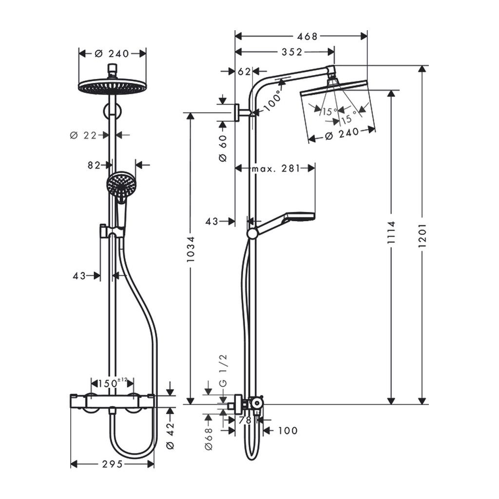 • Dĺžka sprchového ramena hlavovej sprchy: 350 mm