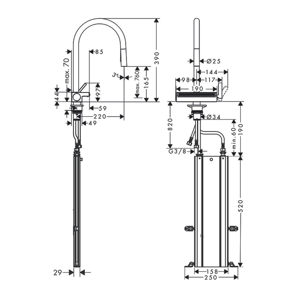 • Požadovaný otvor pre batériu 35 mm, Odporúčanie: otvor pre batériu max. 50 mm od zadnej časti umývadla