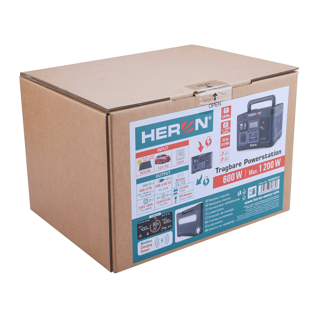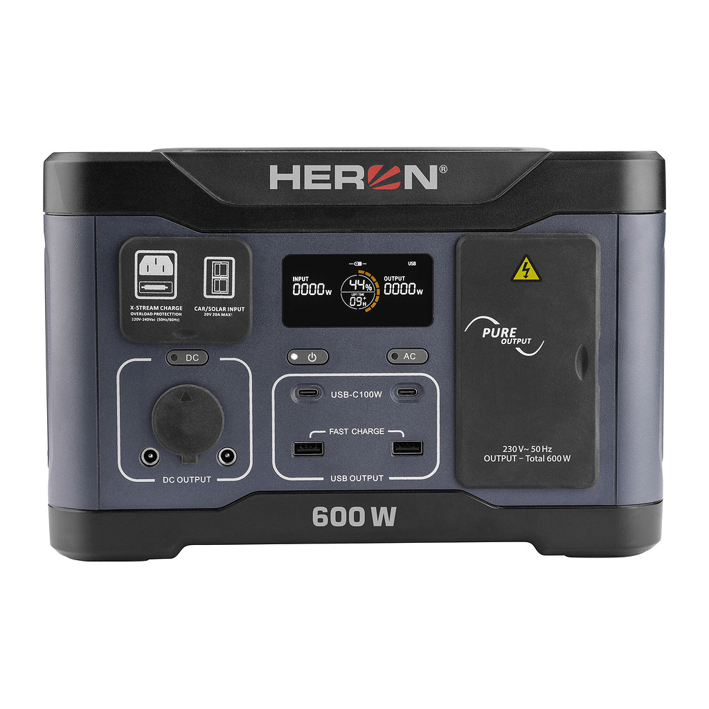 Prenosná nabíjacia stanica HERON je spoľahlivým zdrojom energie pre domácnosť, outdoorové aktivity, cestovanie, ale aj pri výpadkoch elektriny. S prevádzkovým výkonom až 600W dokáže napájať širokú škálu zariadení, vrátane elektroniky, osvetlenia či malých spotrebičov. Absencia spaľovacieho motora robí tento zdroj jednoduchým na obsluhu, jeho prevádzka je bez hluku a exhalátov, čo umožňuje využitie aj v interiéri. Vďaka technológii LiFePo4 batérií ponúka dlhú životnosť, vyššiu bezpečnosť a stabilný výkon. Stanica disponuje viacerými výstupmi, vrátane dvoch 230V zásuviek, USB-C s max. výkonom až 200 W a rýchlonabíjacím USB-A QC 3.0 portom, ktoré umožňujú nabíjať smartfóny, notebooky a ďalšie zariadenia rýchlo a efektívne. Invertorová technológia zaručuje čisté výstupné napätie na 230V zásuvkách, vhodné aj na napájanie citlivej elektroniky. Na hornej strane ponúka bezdrôtové nabíjanie mobilných zariadení a na zadnej strane je vybavená svietidlom s 5 režimami svietenia. Podpora solárneho nabíjania (MPPT) z nej robí ekologické riešenie na cestách. Kompaktné rozmery a nízka hmotnosť 7kg umožňujú jednoduchú manipuláciu. Táto stanica je perfektným riešením pre každého, kto potrebuje spoľahlivý a flexibilný zdroj energie kdekoľvek.