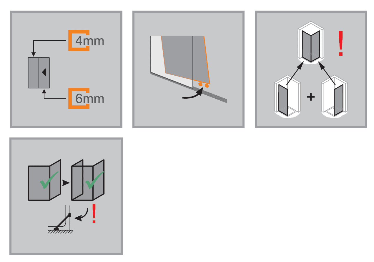 • Zasklenie 6 mm (dvere) a 4 mm (pevný segment) jednovrstvovým bezpečnostným sklom podľa normy DIN EN 12150