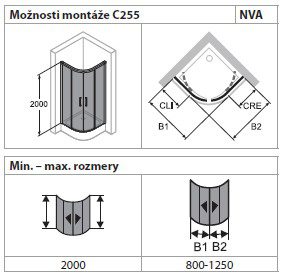 • Čiastočne orámovaný sprchovací kút v tvare štvrťkruhu s dvoma posuvnýmisegmentami, z ktorých sa každý otvára na jednu stranu, a s dvomapevnými segmentami